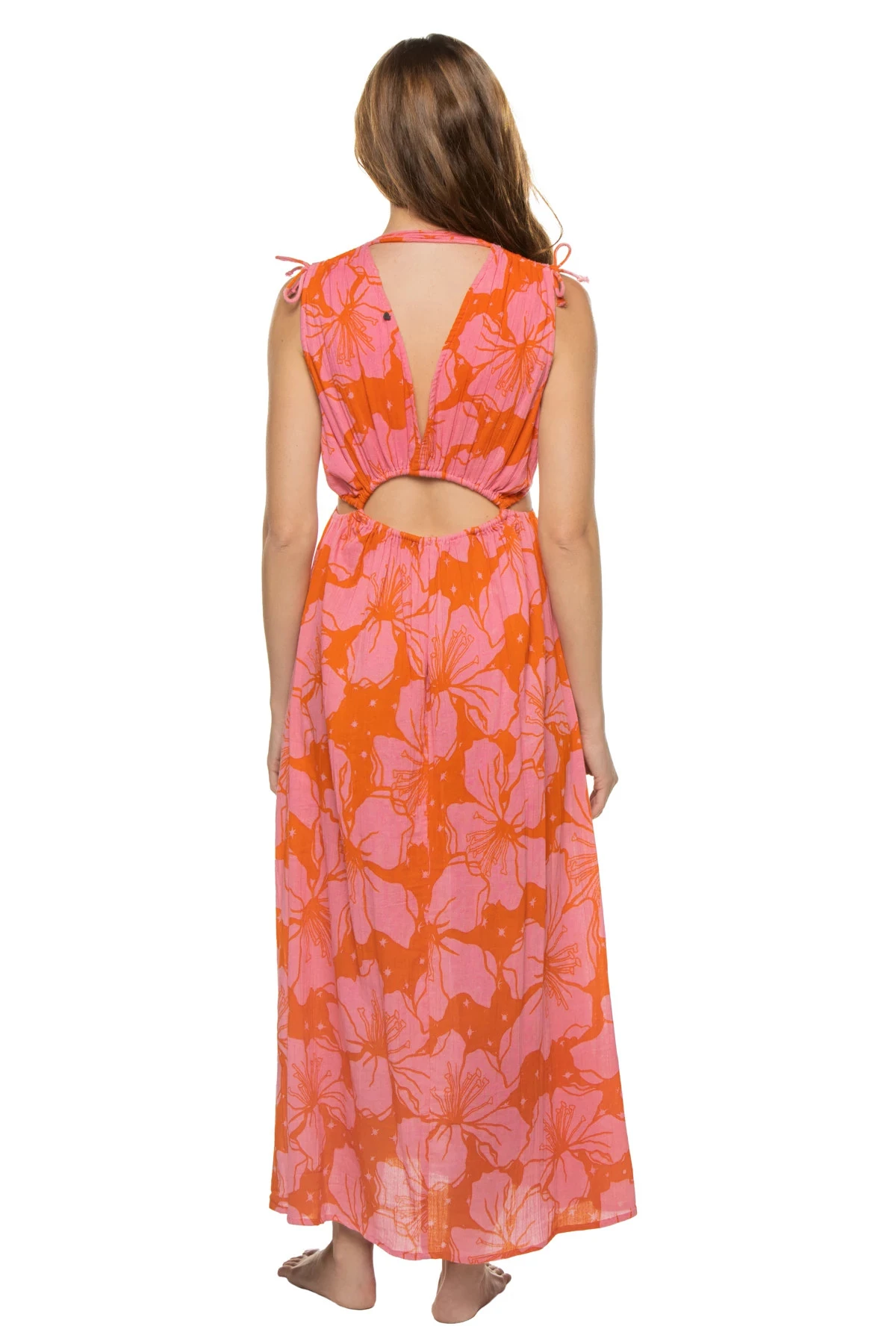 Aloha maxi dress features a floral print with waistline cut-outs and side slits. Offers an adjustable tie closure.