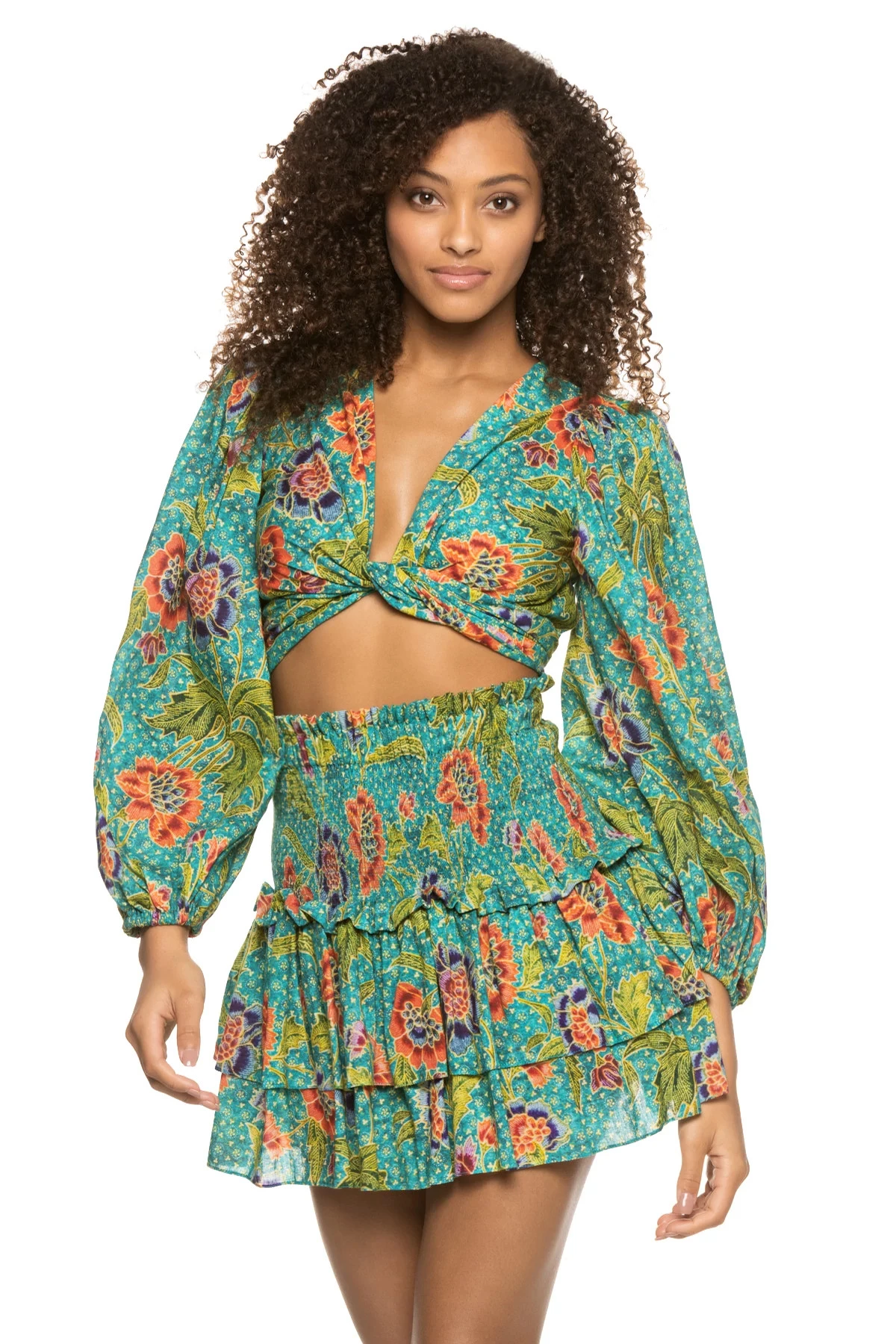 Asmara cropped blouse features a floral print and a cropped midriff offering ties at the back.