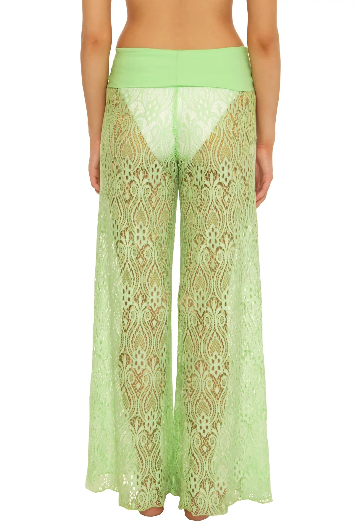Cover up pant features an open weave lace fabric with a soft waistband and wide leg openings.