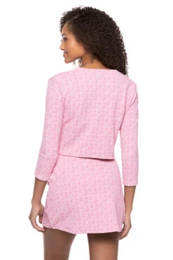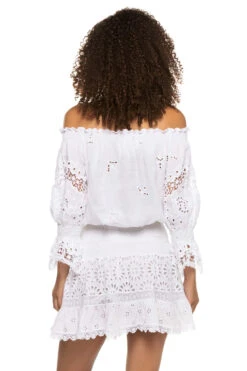 Bardot crop top features a crochet knit overlay with off-shoulder sleeves and ruffle detail.
