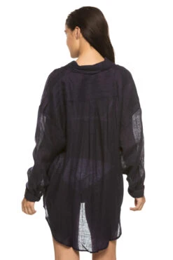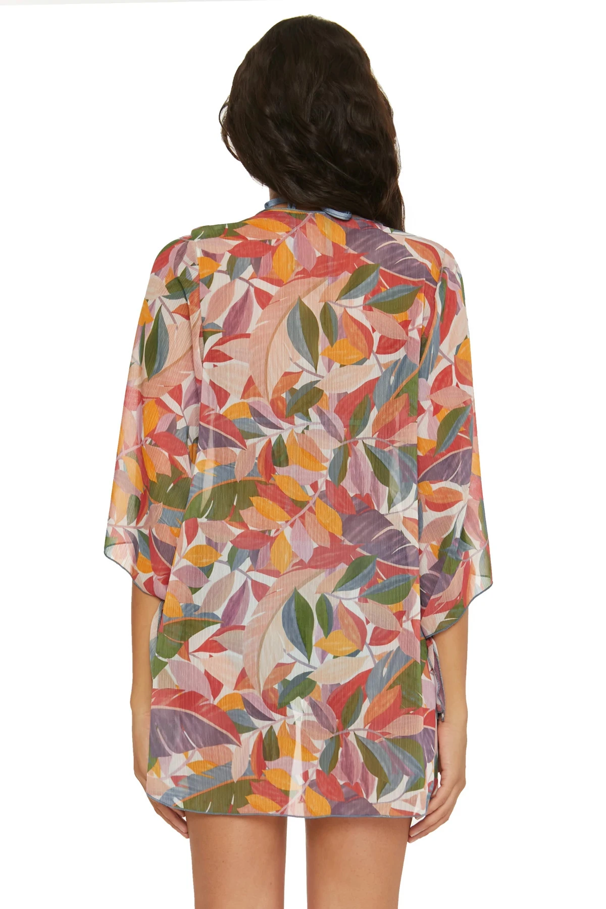 Bora bora kimono features three-quarter length tie sleeves and offers an open tie front closure.