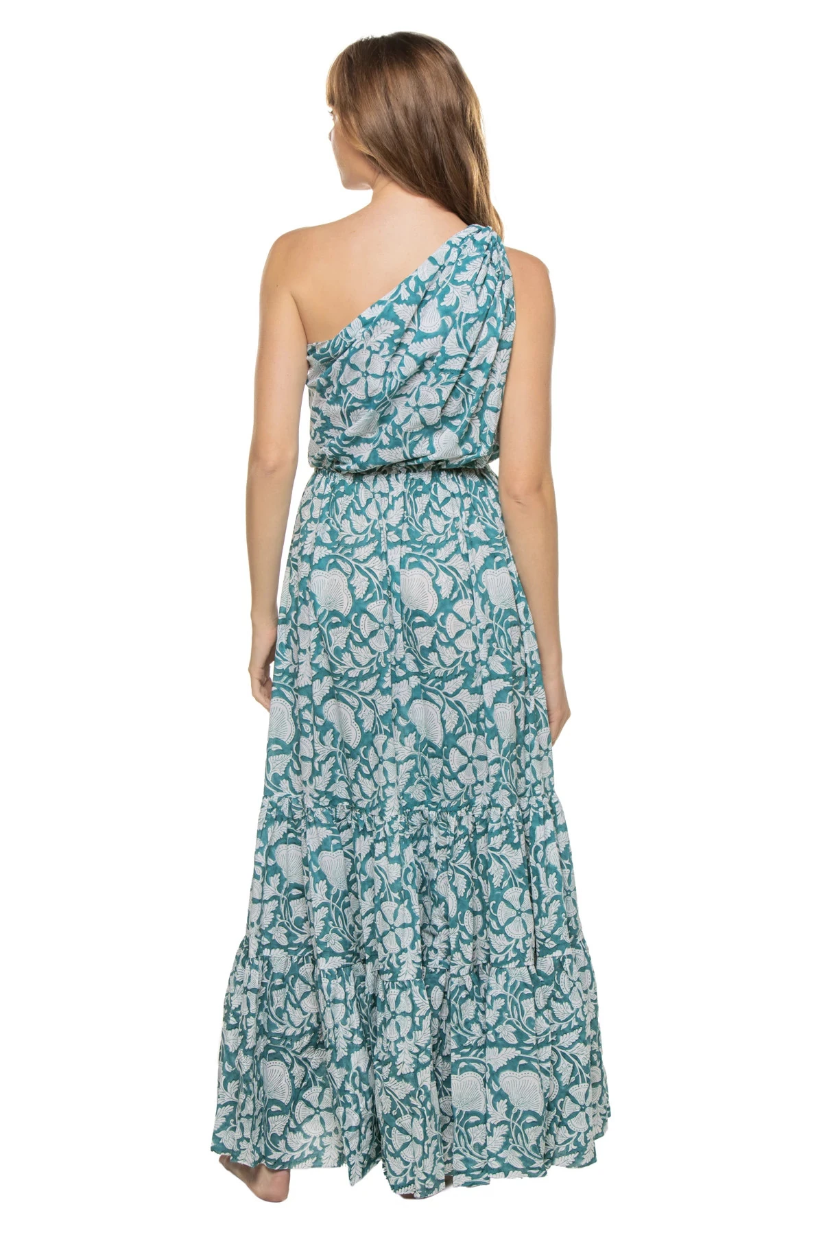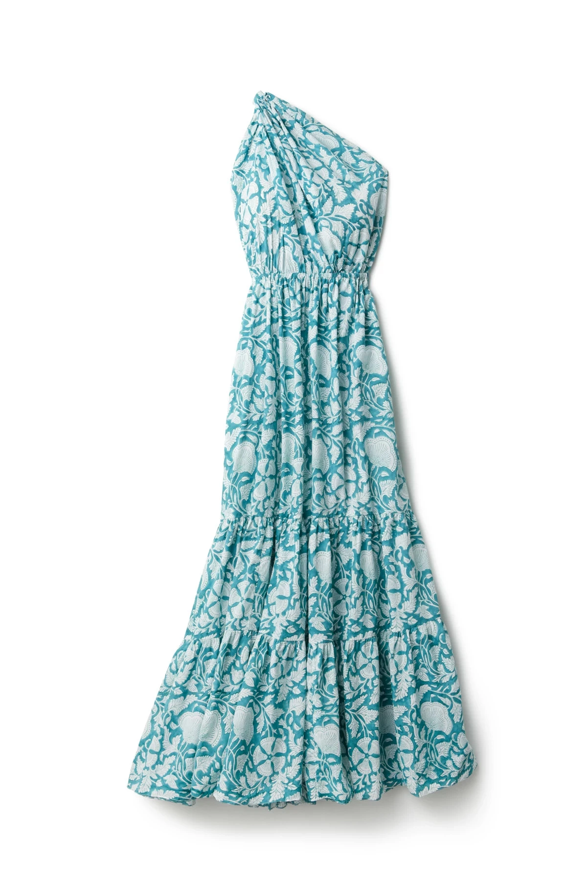 Botanica maxi dress features a floral fabrication and offers an asymmetrical strap, elastic waistband, and tiered skirt.