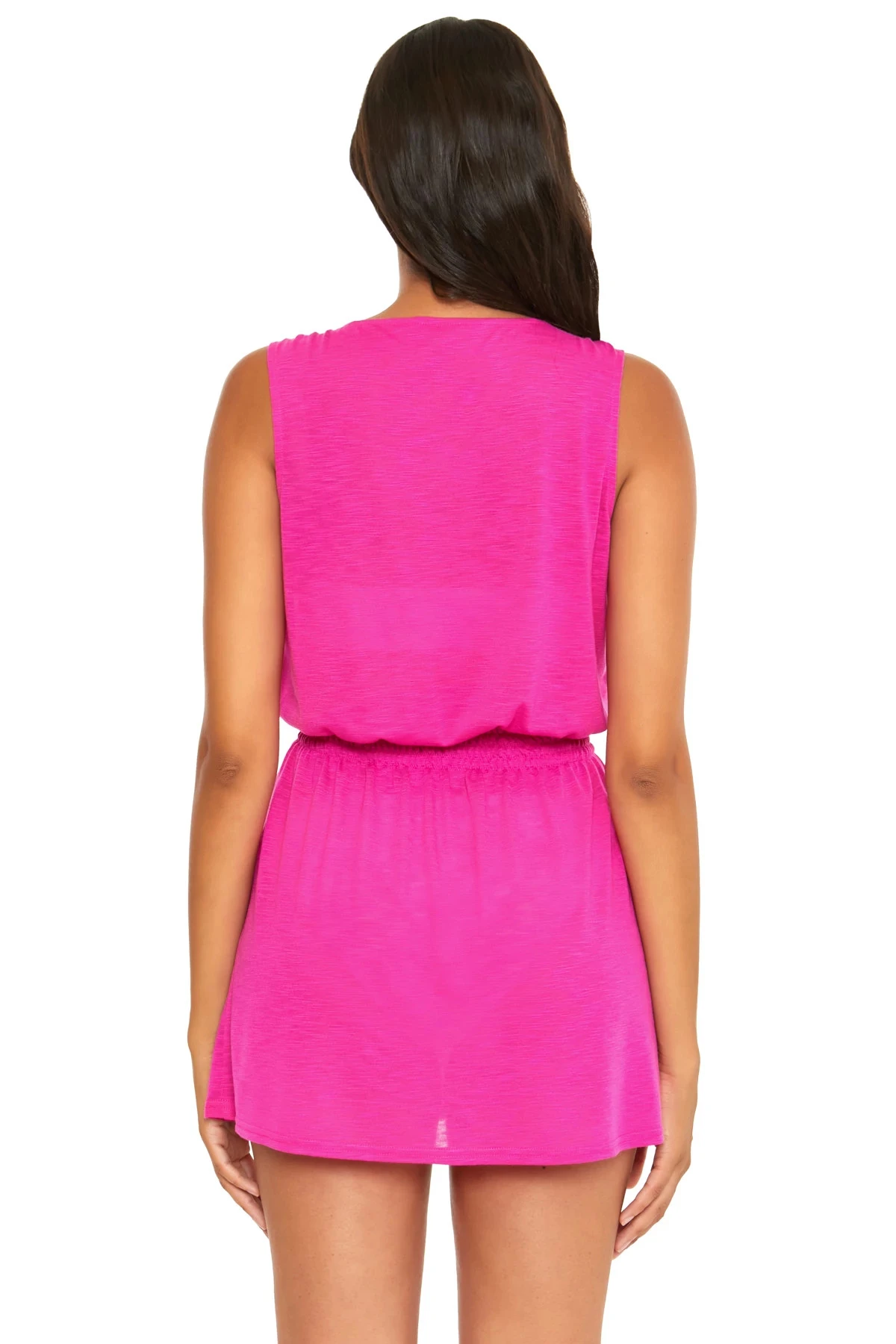 Breezy basics mini dress features a smocked waistline, v-neckline, and ring details on the straps.