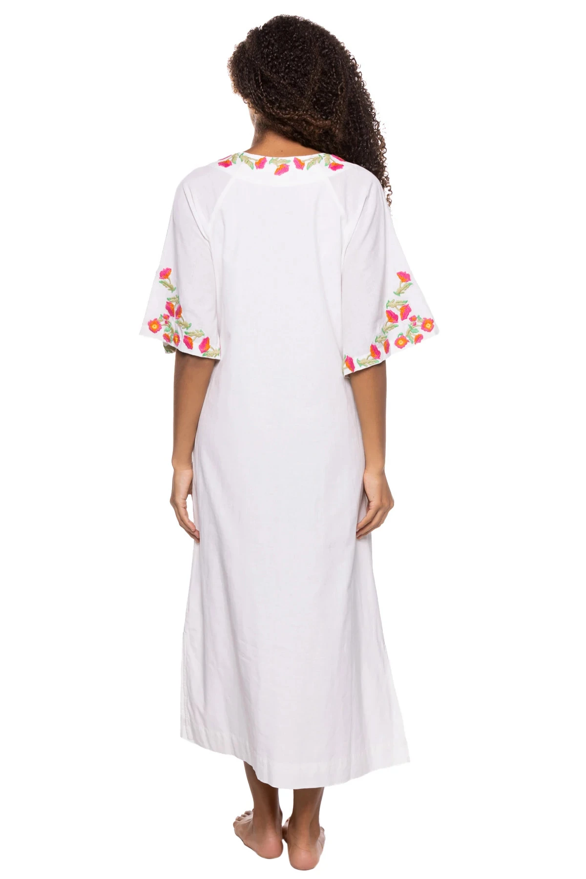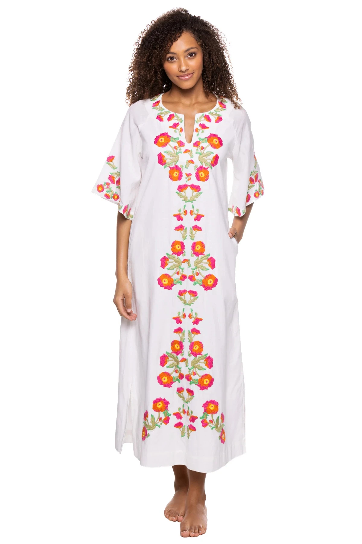 Charming caftan features custom poppy floral embroidery, a split neckline, pockets and side slits and offers a generous fit.