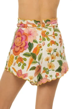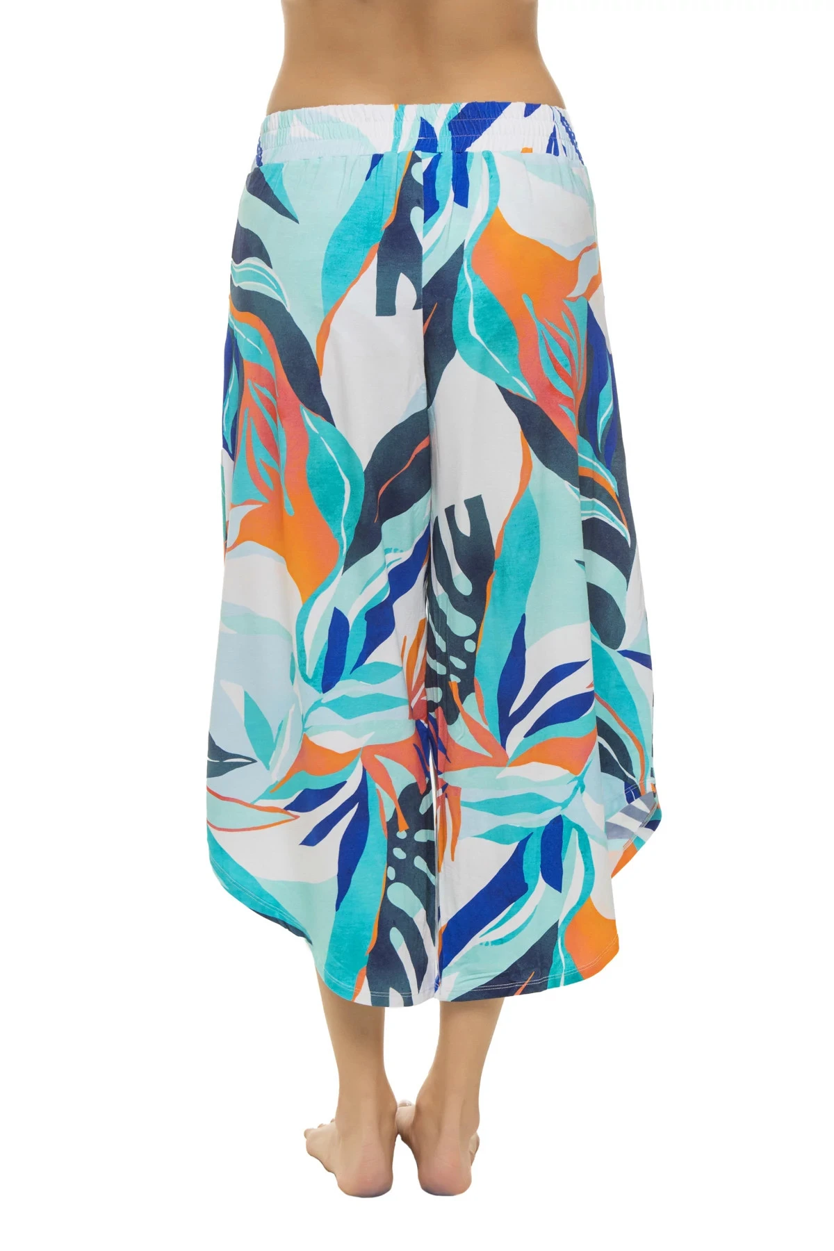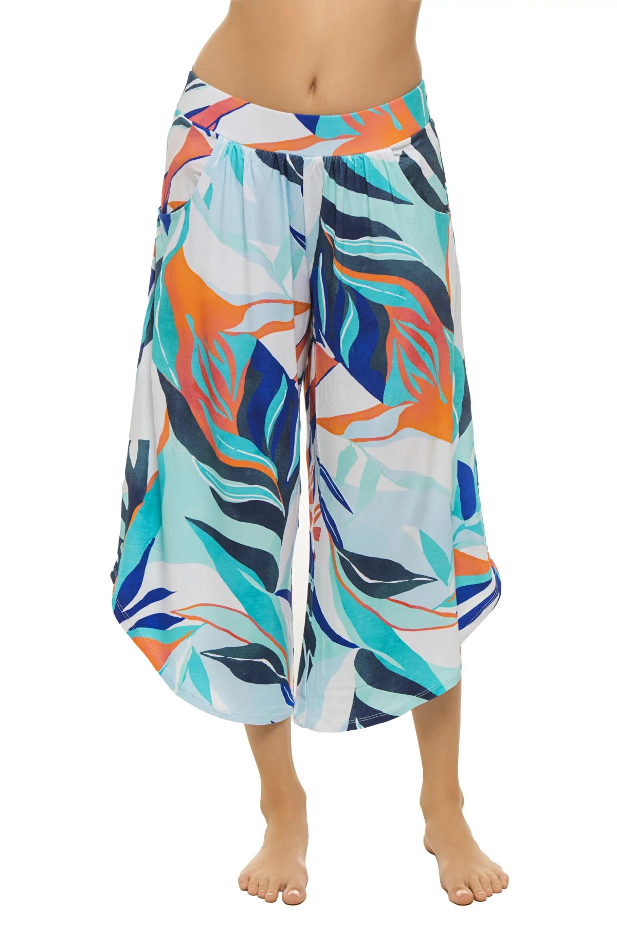 Cropped palazzo pants features a tropical palm print and offers a wide flowy leg with an asymmetrical hem and banded waist.