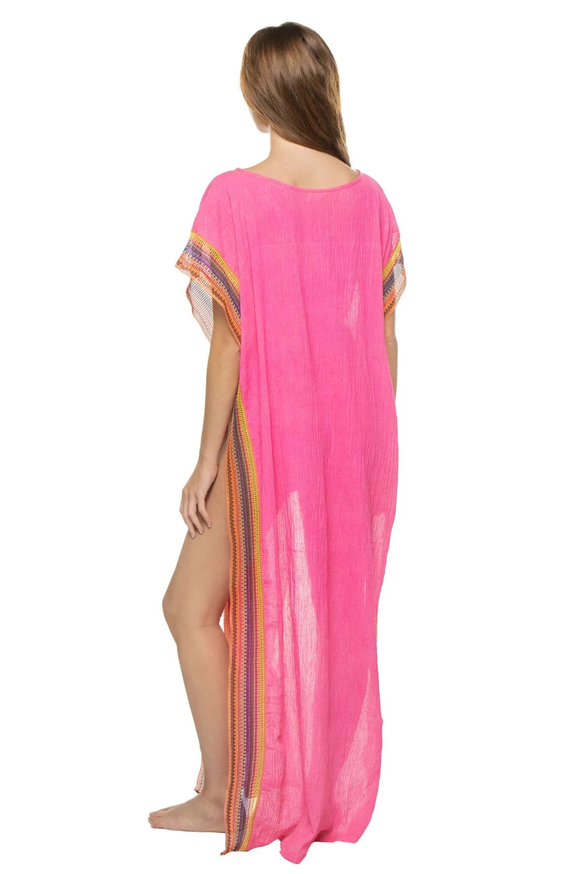 Crinkle caftan features crochet edge detailing.