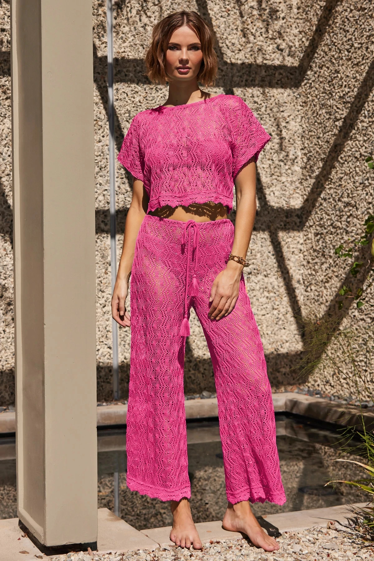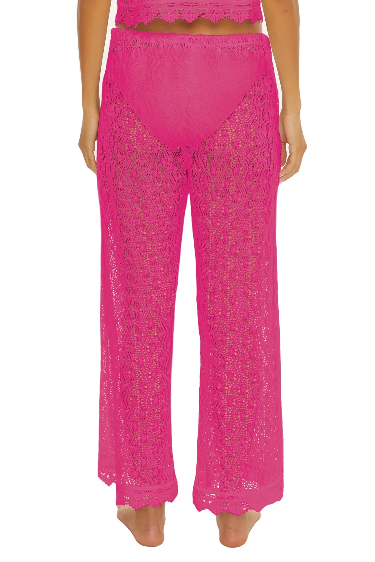 Crop pant features an open weave crochet with lace trim and offers a drawstring waist.