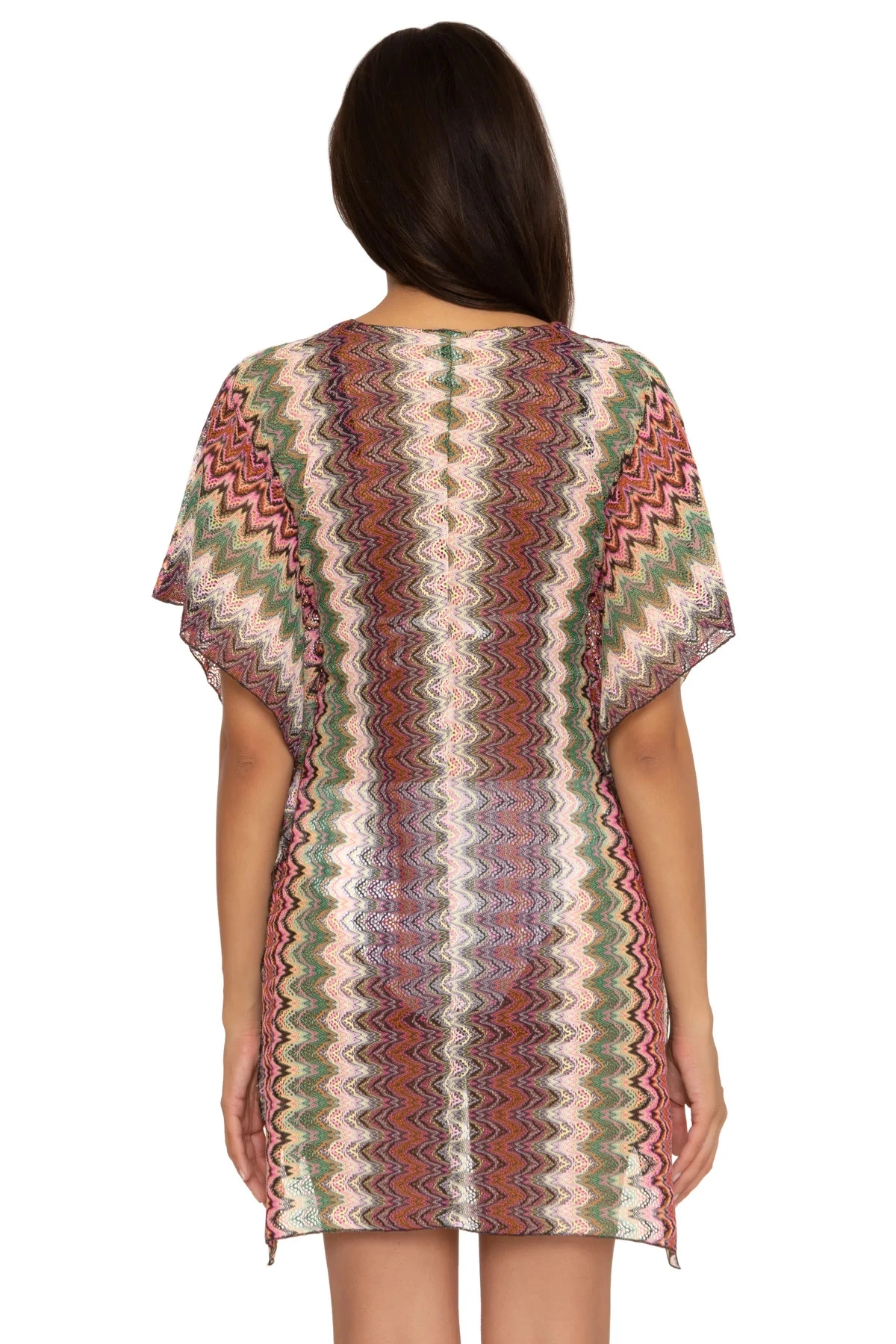 Tunic features a striped crochet lace fabrication and offers a drawstring front waist, open flutter sleeve with a side slit opening and an uneven hemline.