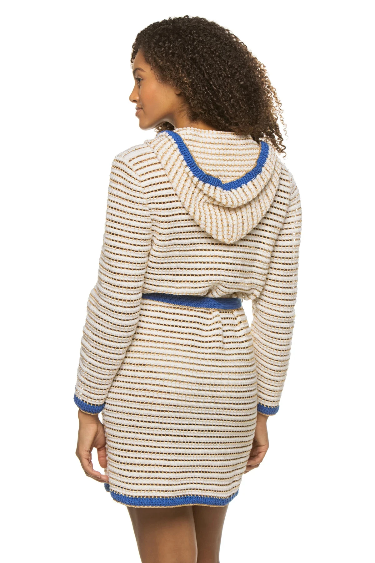 Long sleeve sweater jacket features an open weave crochet knit with contrast trim, front pockets, a hood, and tie front closure.