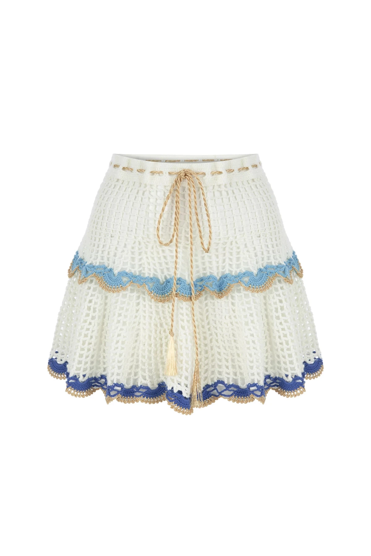 Mini skirt features a hand woven chevron crochet with scallop details. Offers a drawstring waistband.