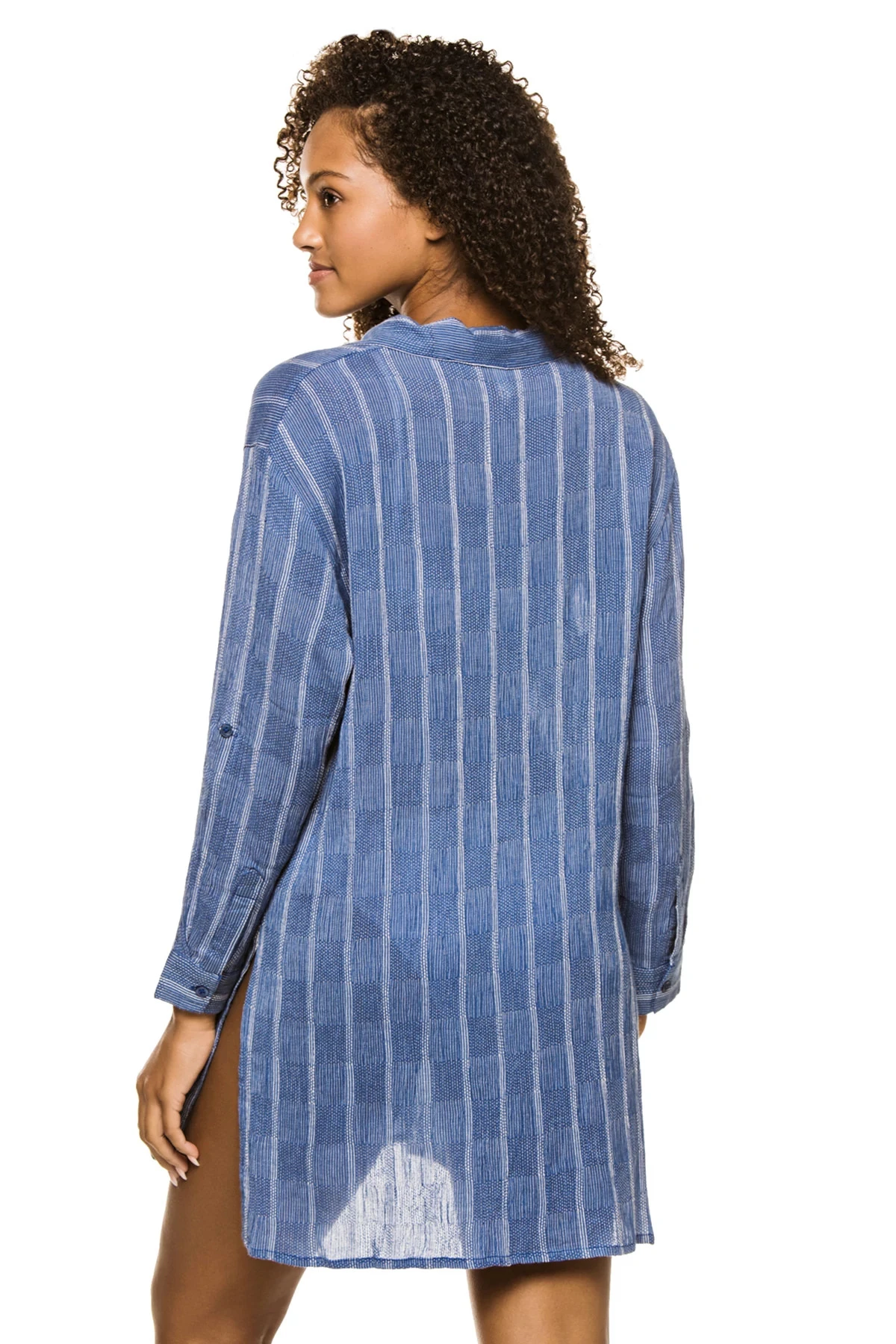 Shirt dress features long cuff sleeves and a collared neckline that offers center front buttons.