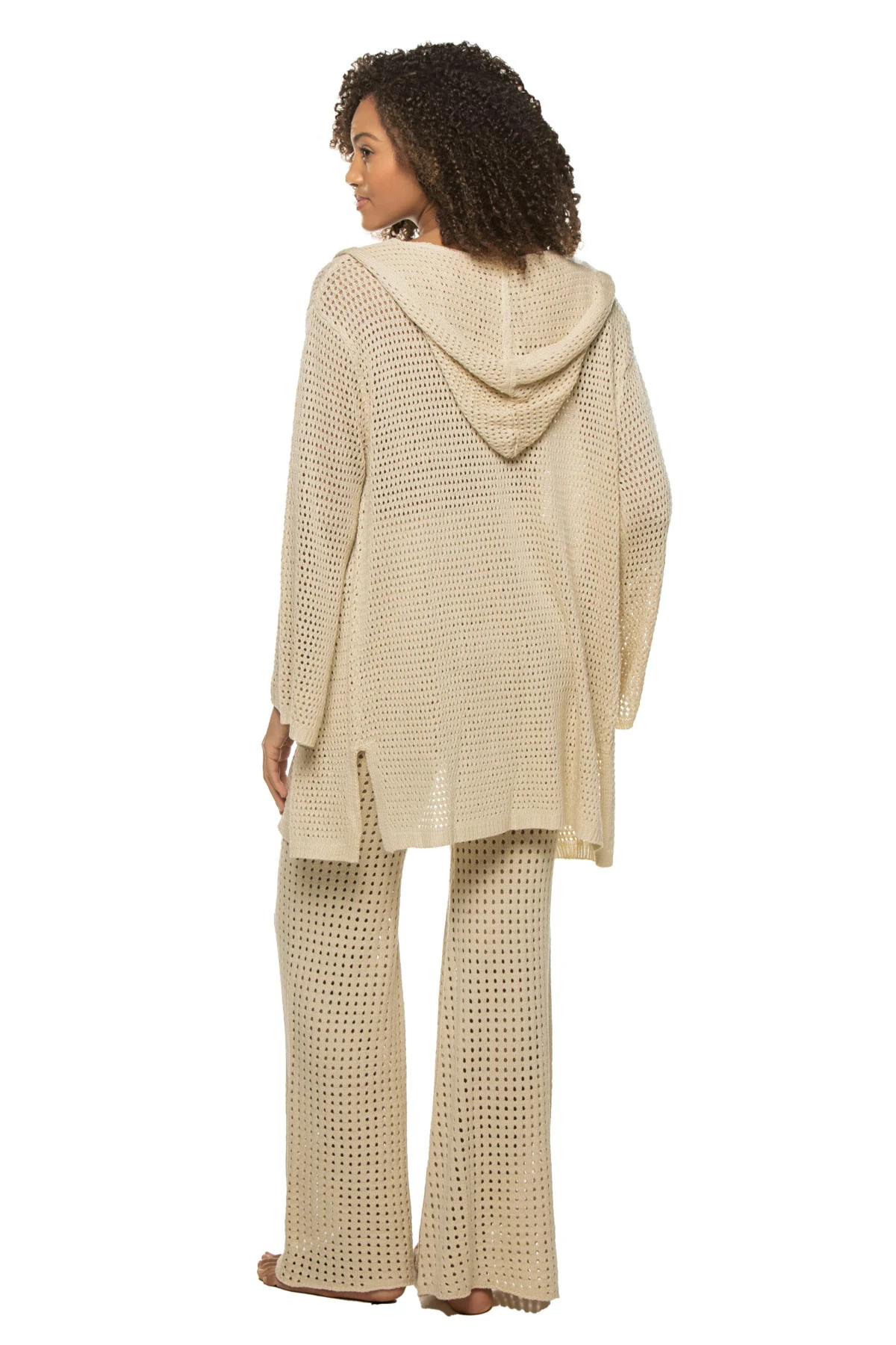 Crochet cardigan features wide long sleeves, an open front and hood.