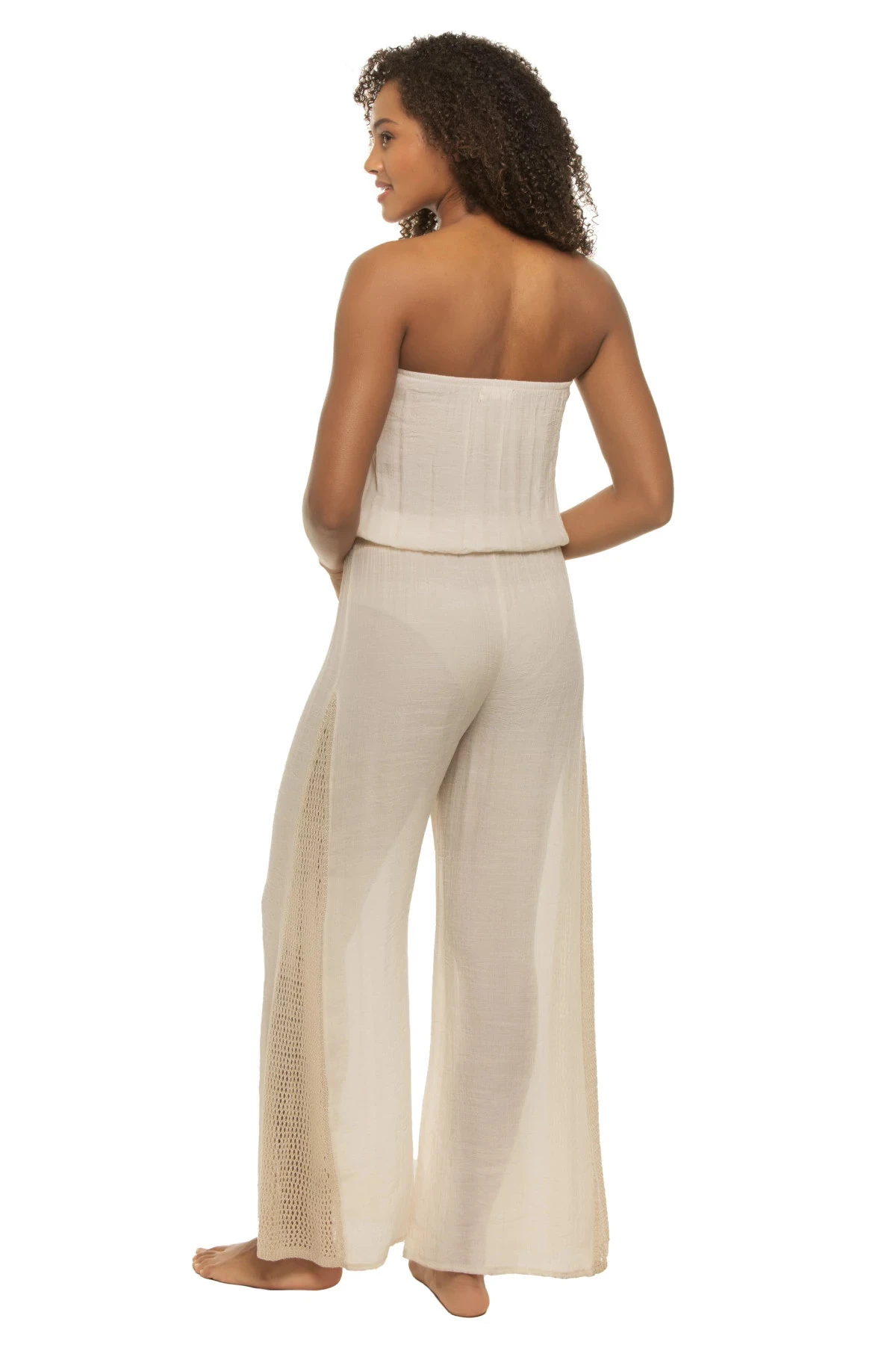 Jumpsuit features a crochet detailed slit leg with a smocked waistband and strapless elastic neckline.