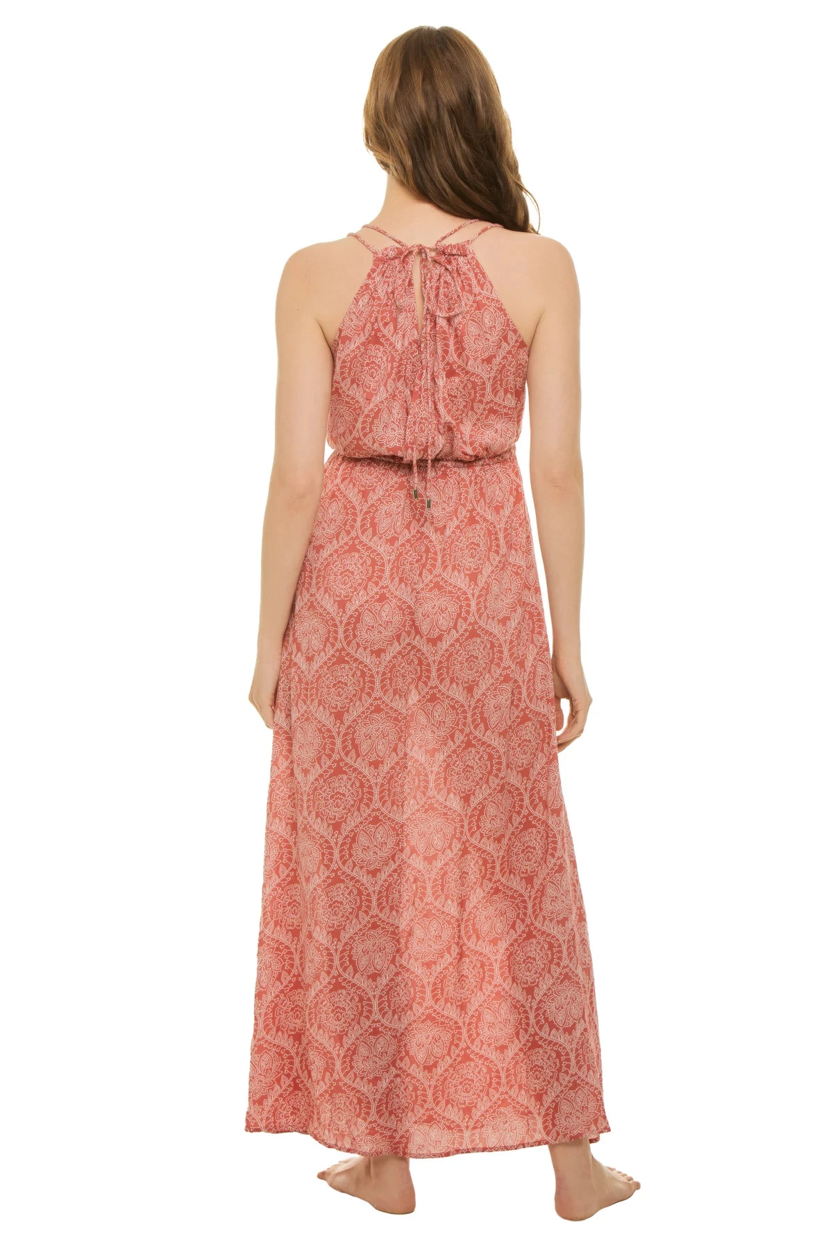 Maxi dress features a wrap front with drawstring ties at waist and a side slit.