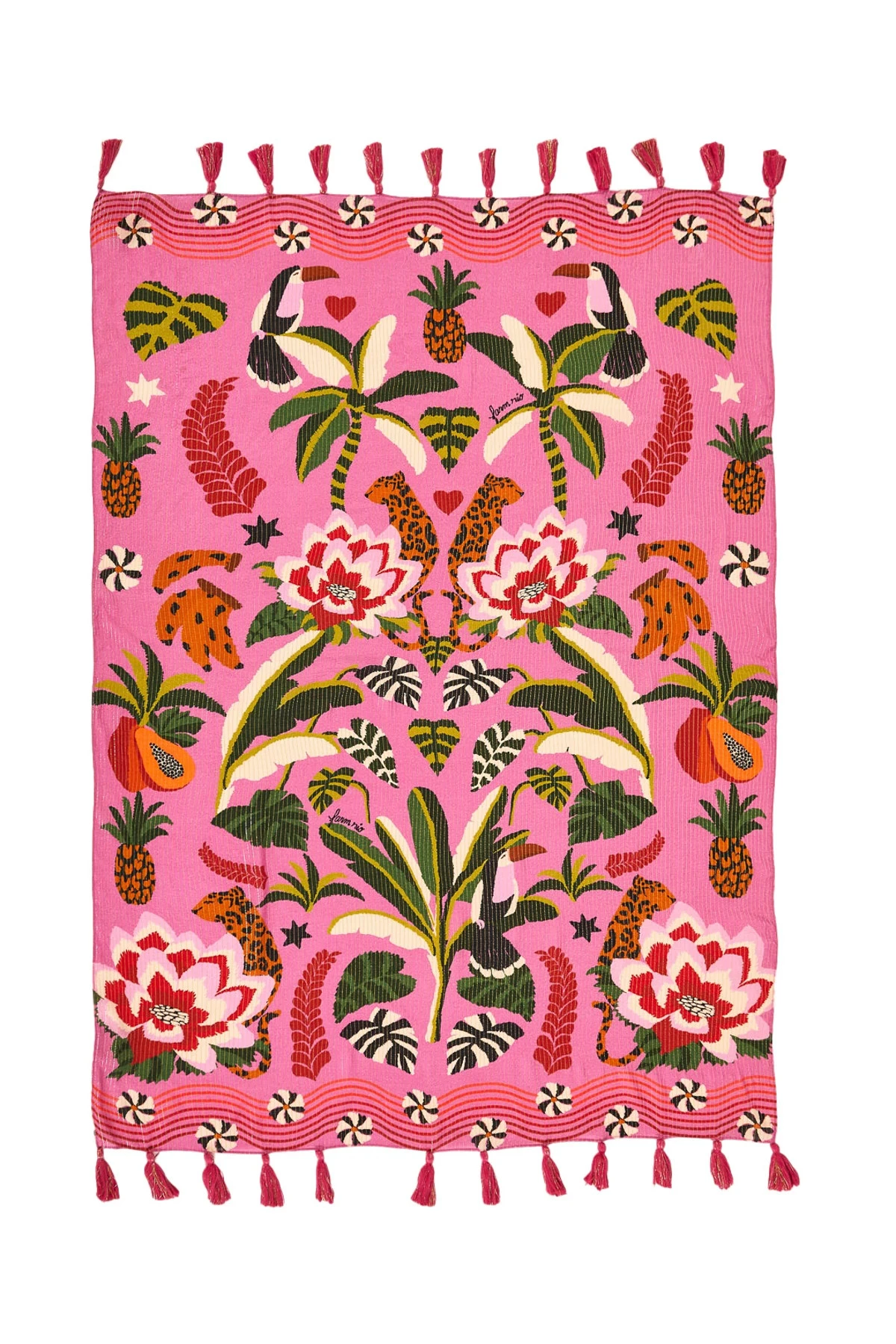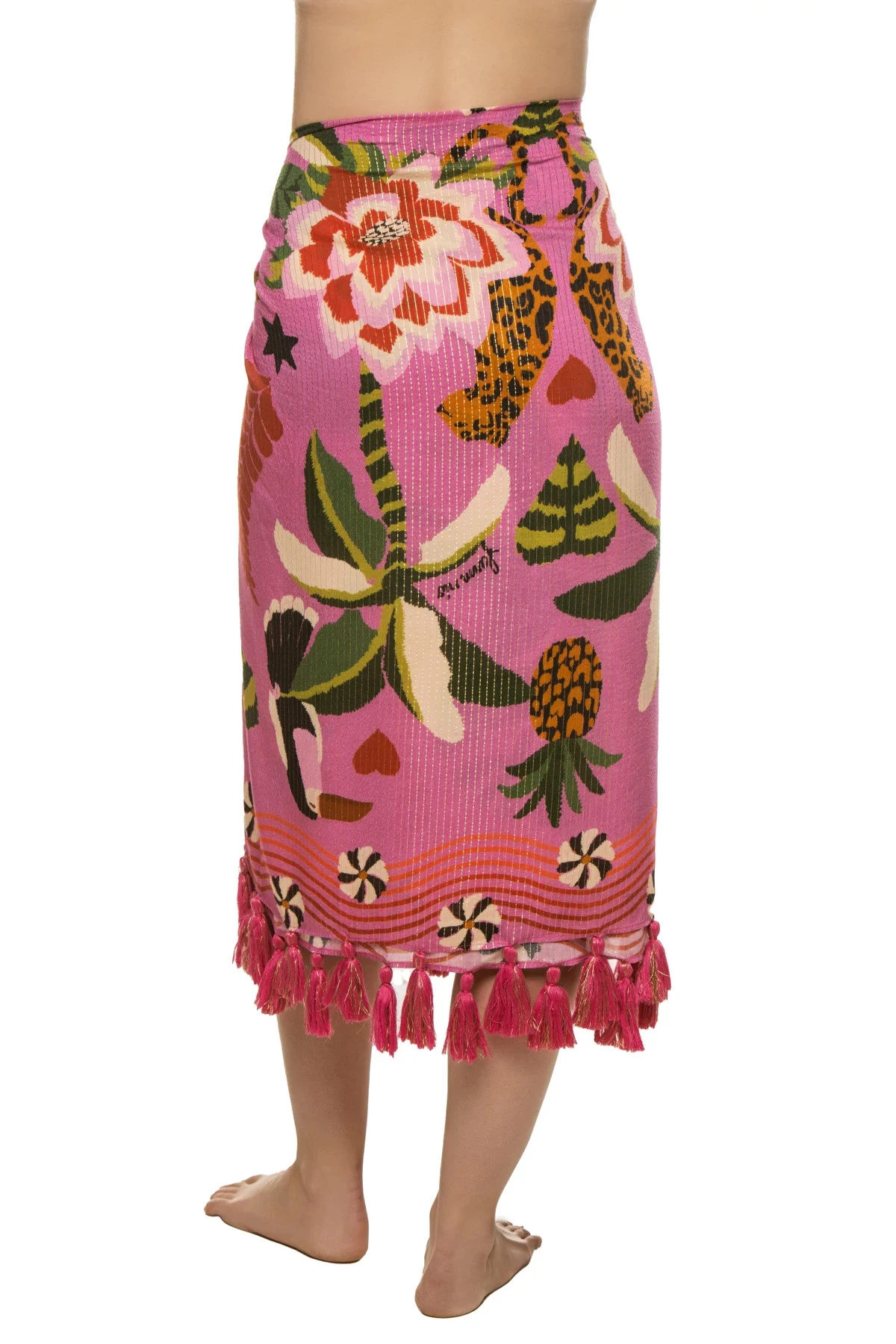 Leopard forest sarong features a bright tropical print with decorative tassels and offers a tie closure.
