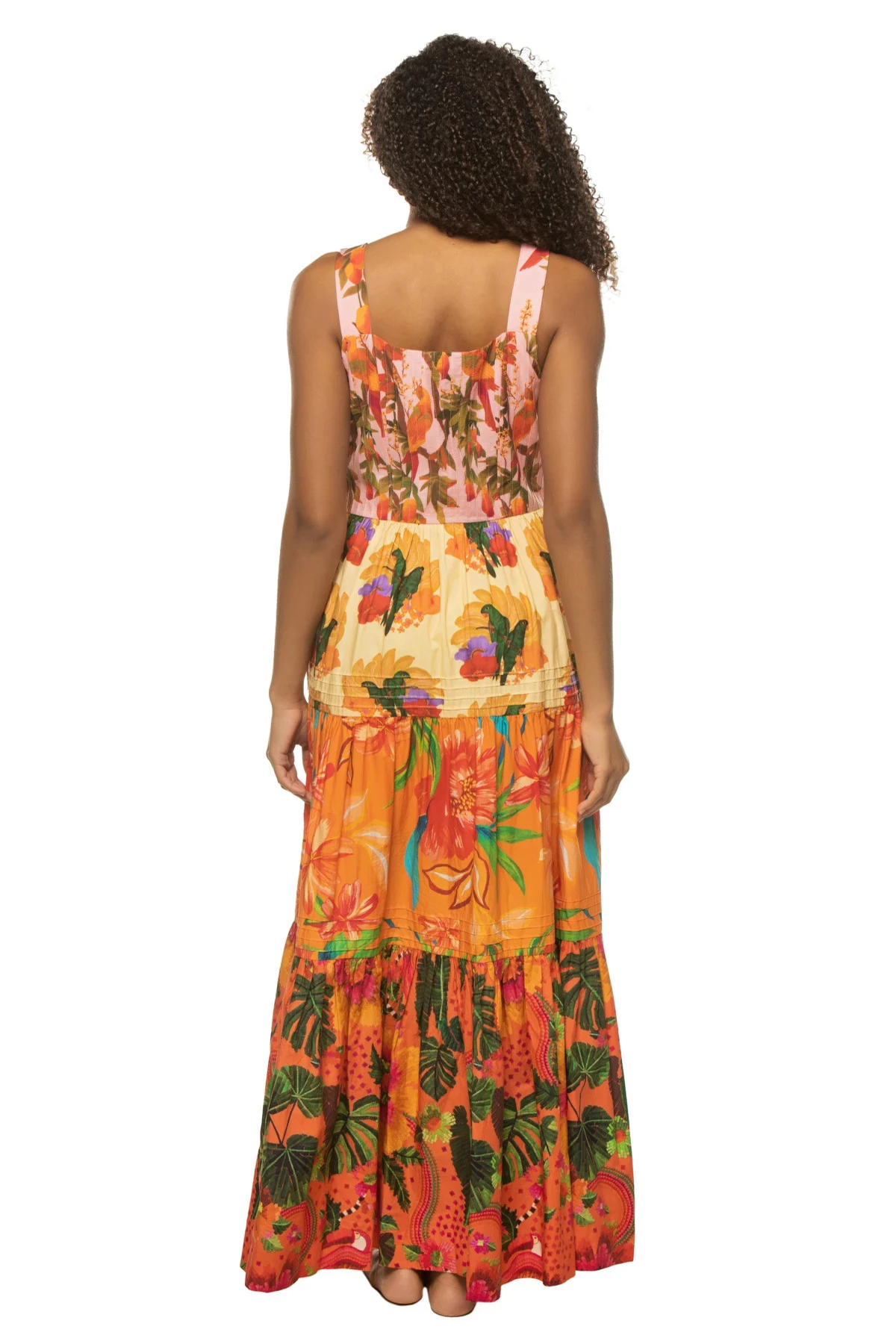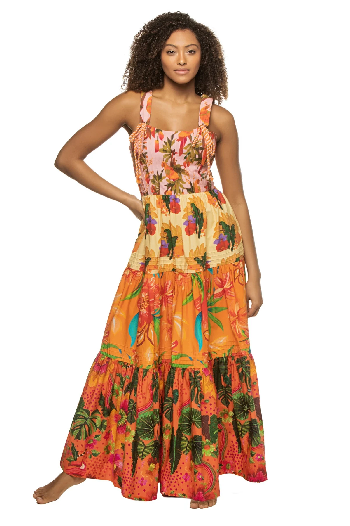 Mixed warm floral maxi dress features a floral print and offers a tiered skirt and wide straps.