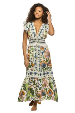 Summer garden maxi dress features a floral pattern with a deep v-neck and ruffled sleeves. Offers a smocked waistband with an adjustable waist tie and decorative tassels.