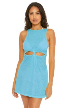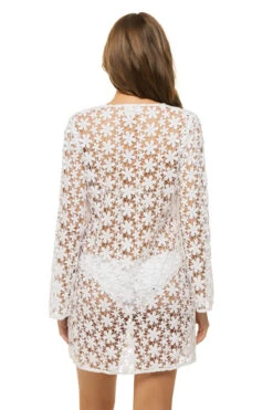 Floral mini dress features a v-neckline with trim detail, decorative front buttons, long billowing sleeves and a flounce hem skirt.