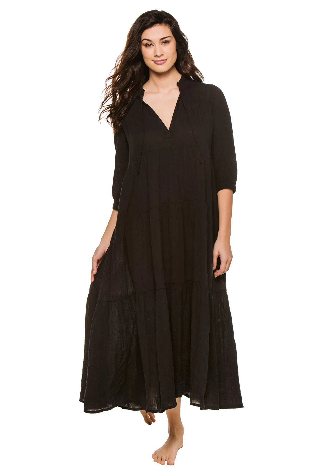 Giselle maxi dress features a semi-sheer tiered fabrication with a relaxed fit and three-quarter sleeves and offers an open neckline with ties and shell buttoned cuffs.