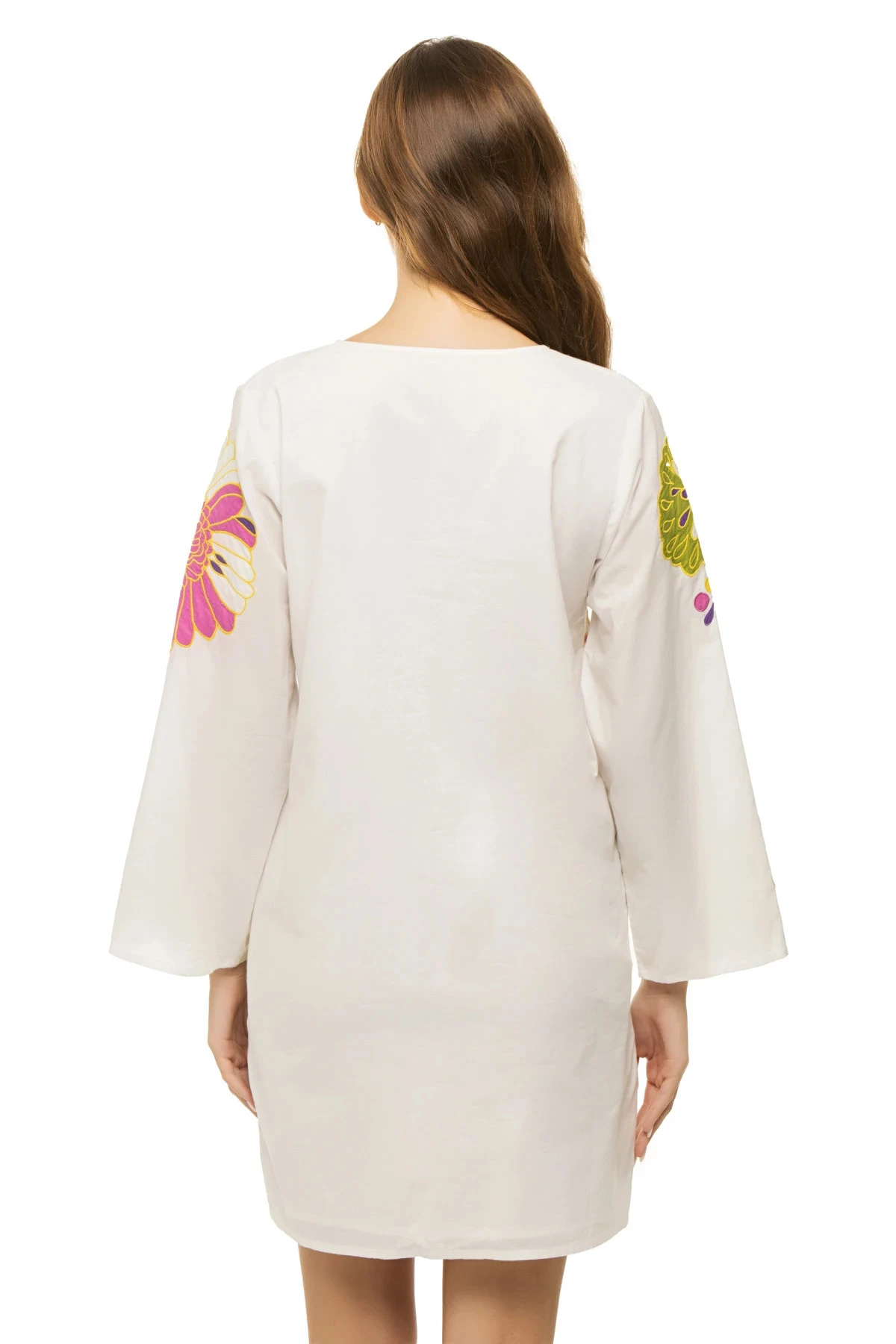 Goldie African Daisy tunic features an A-line silhouette, a v-neckline and three-quarter sleeves.