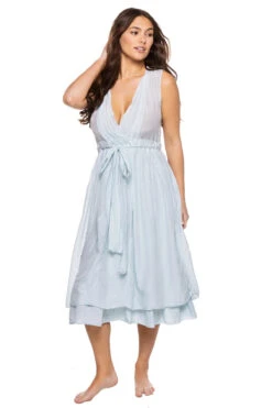 Julia midi dress features a wrap-effect v-neckline with a pleated ruffle skirt and offers drawstring ties at waist.