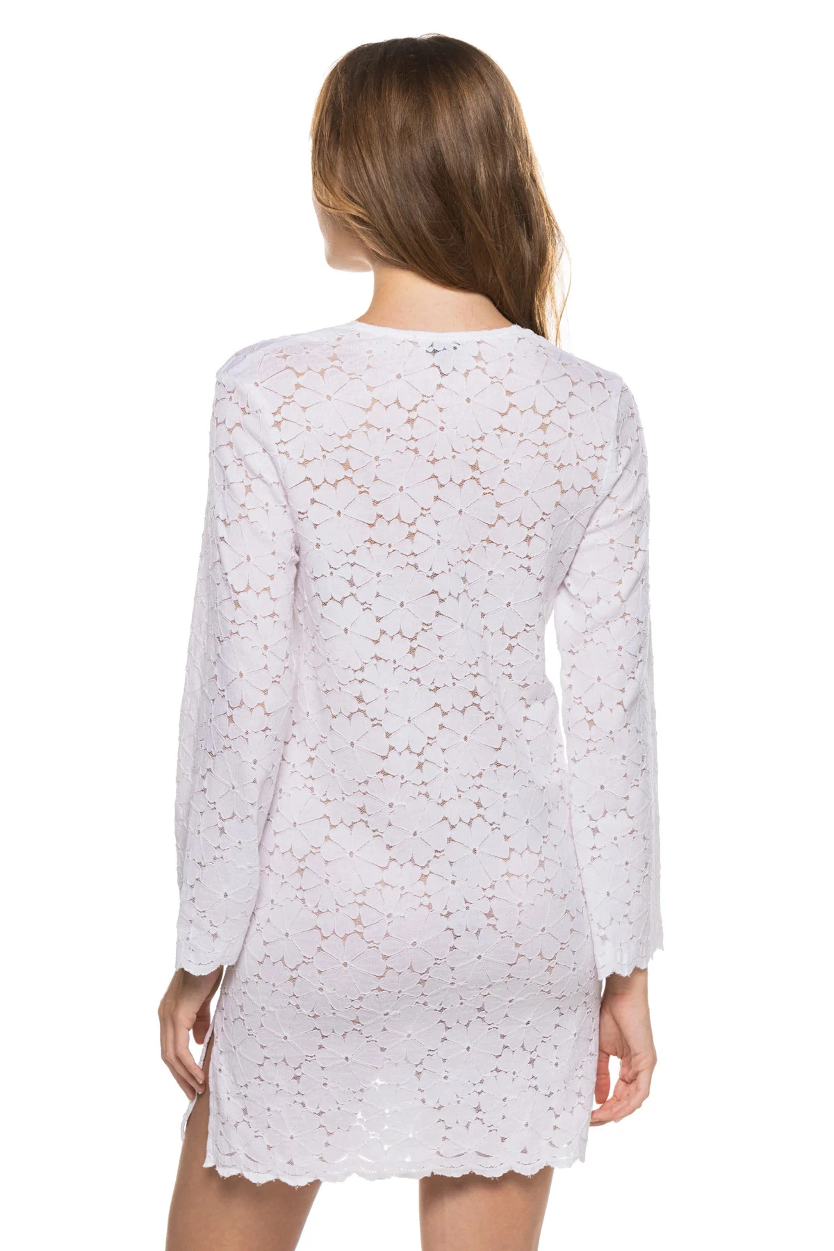 Tunic features a lace fabrication with a v-neckline, long sleeves, front pockets, and side slits.
