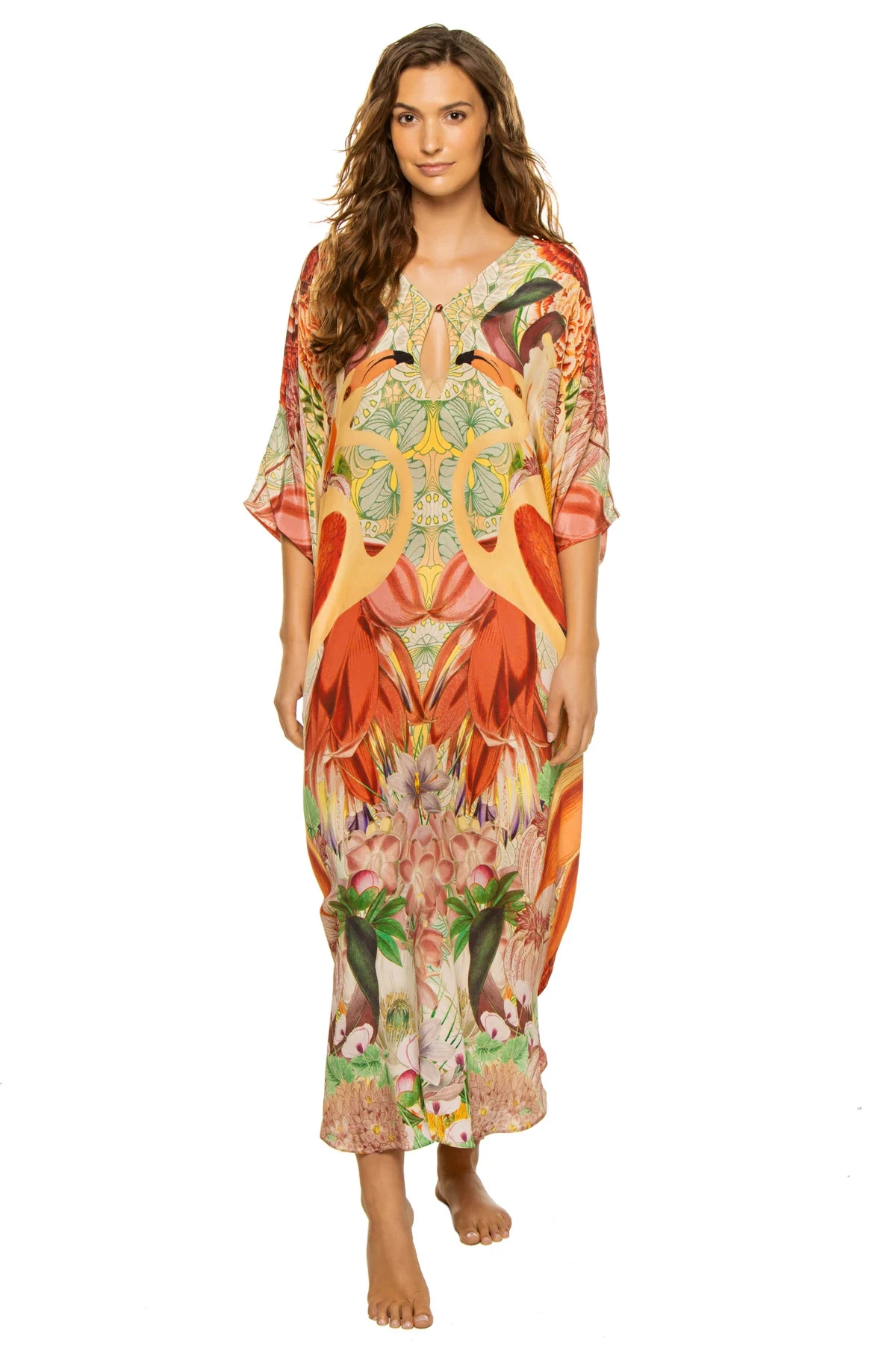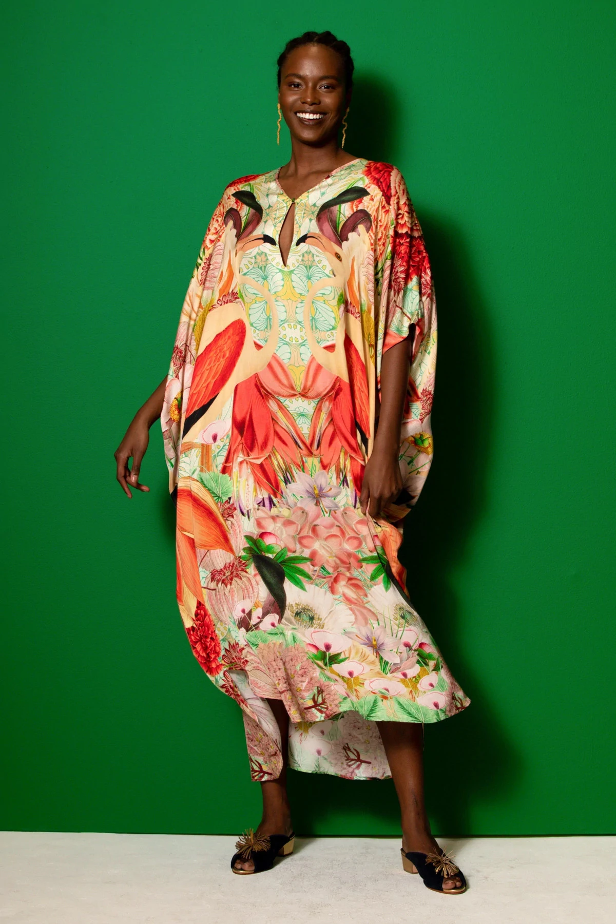 Long Xime caftan offers a relaxed fit and features a bold floral print with a front keyhole cutout, wide sleeves and a high low hem.
