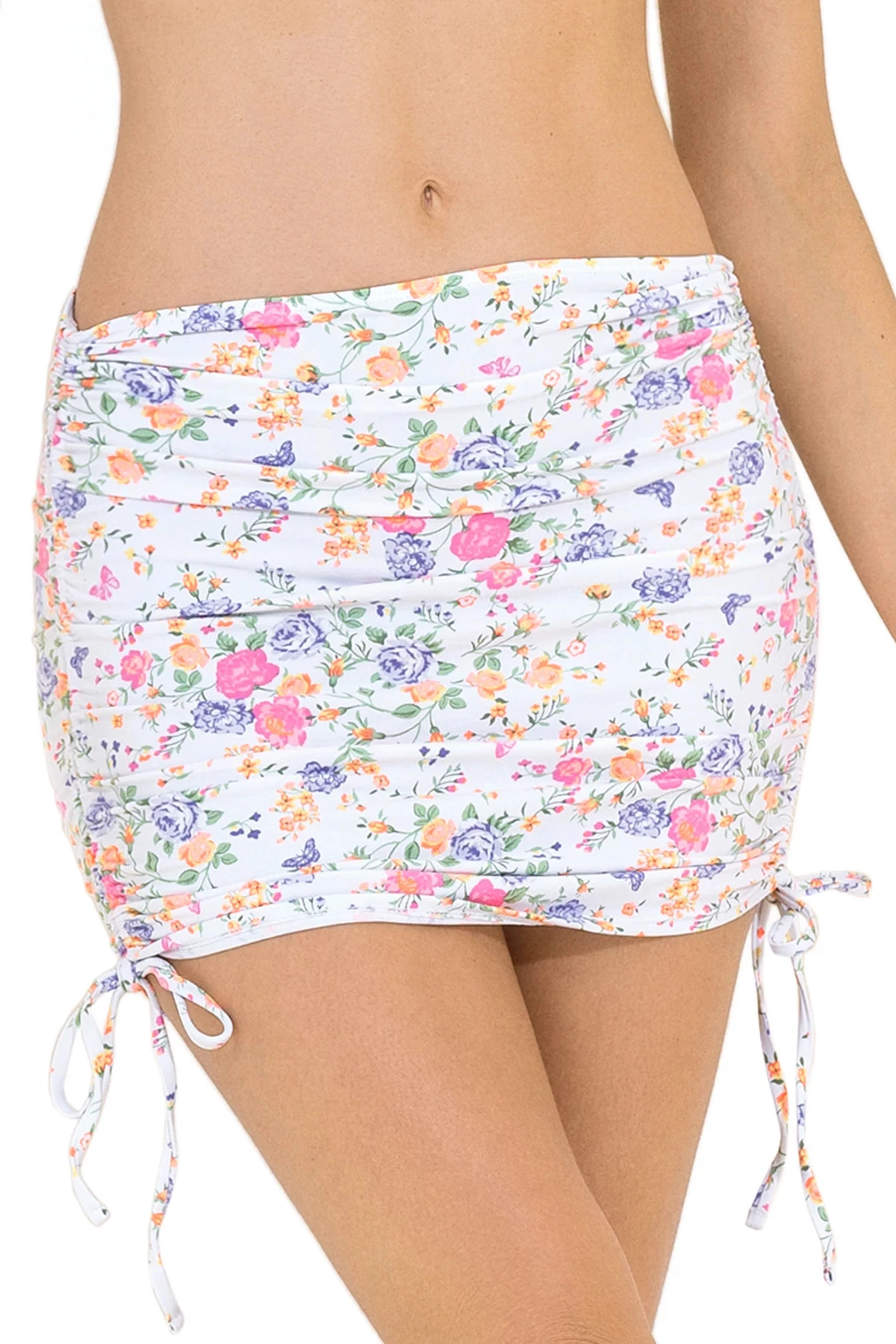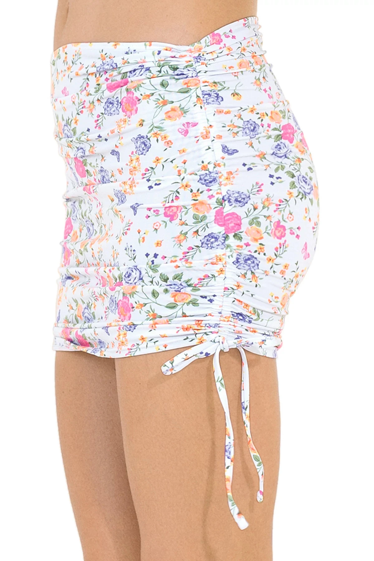 Alison mini skirt features a textured fabrication and ruched adjustable tie sides.