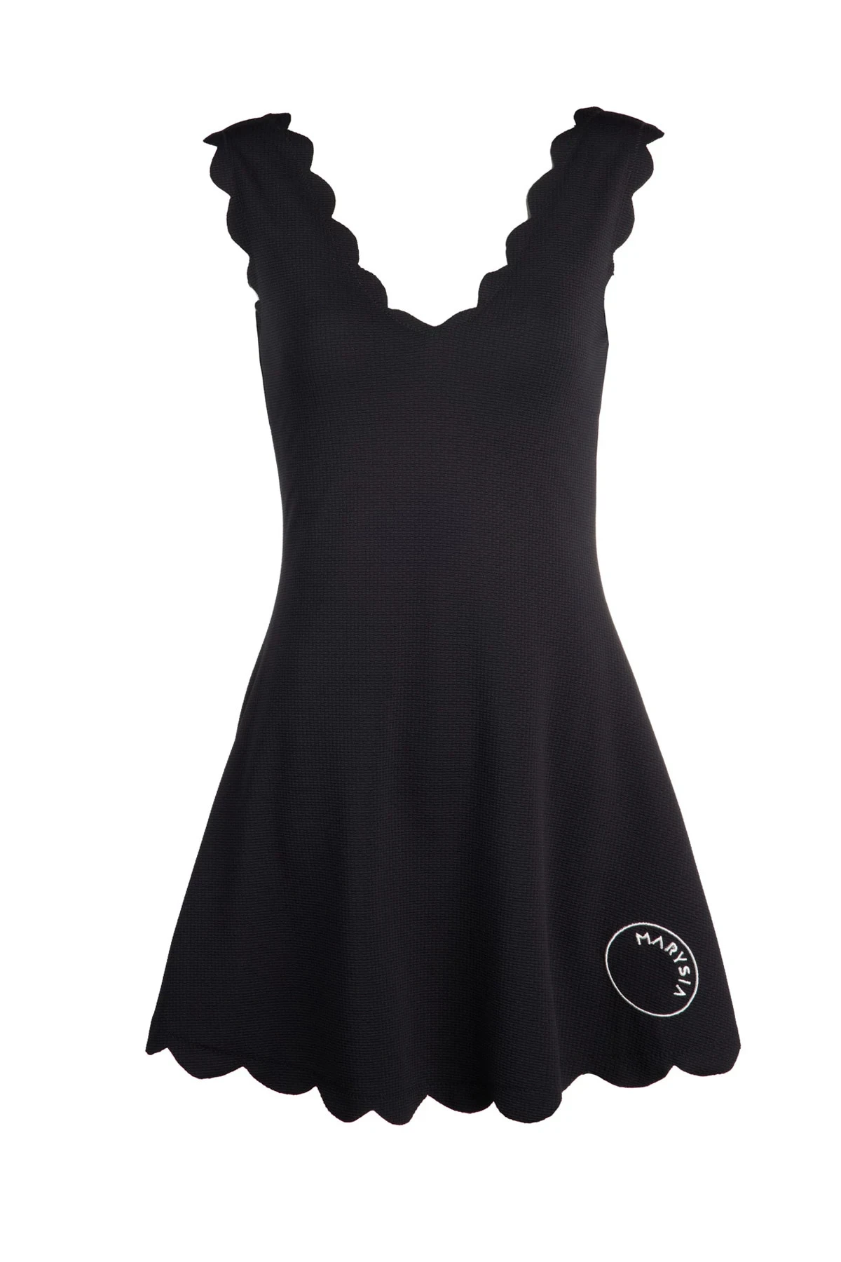 Venus mini dress features a v-neckline with a scalloped hem and built in shorts. Offers full coverage.