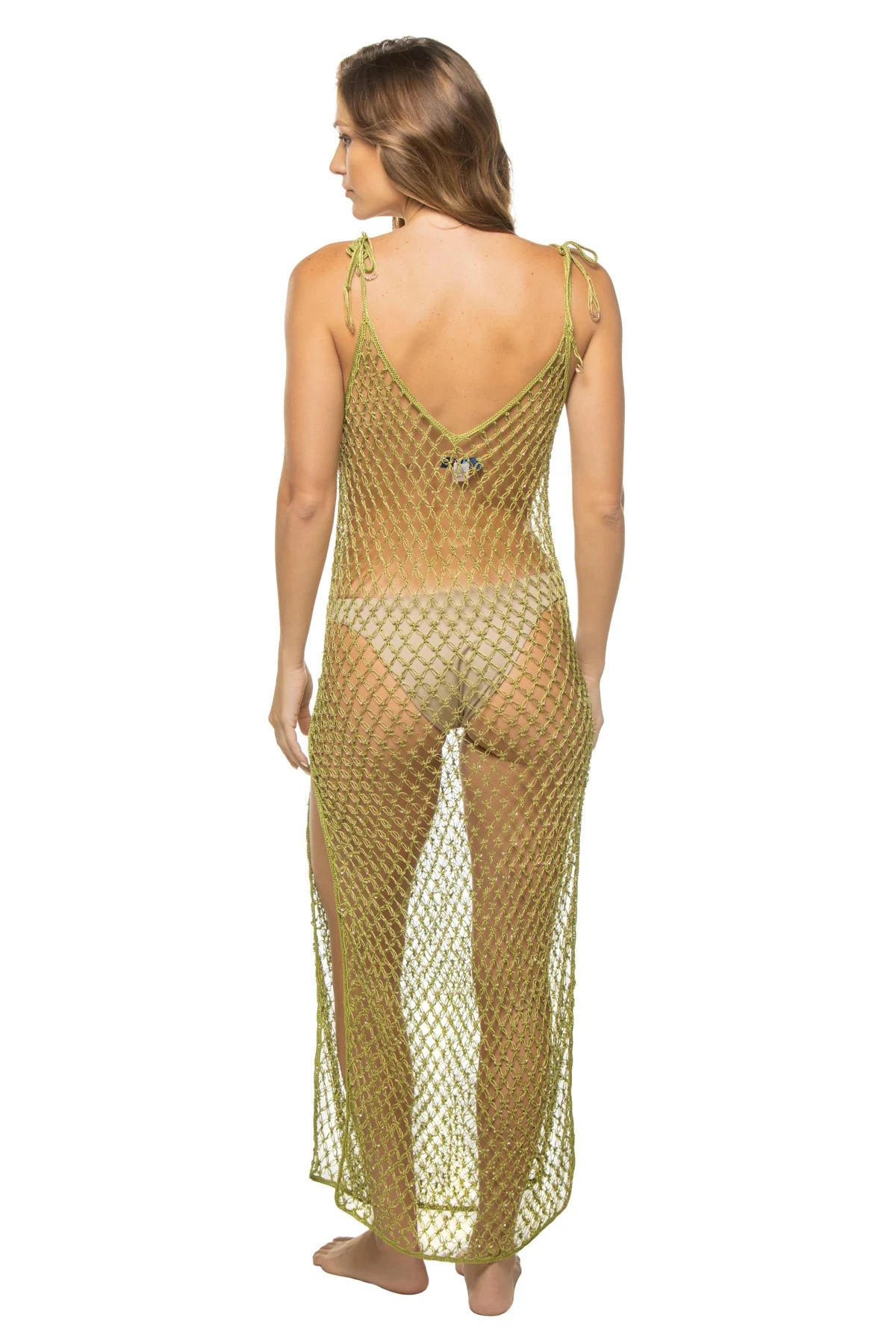 Cover up features a metallic open weave crochet with a v-neckline and large side slits.
