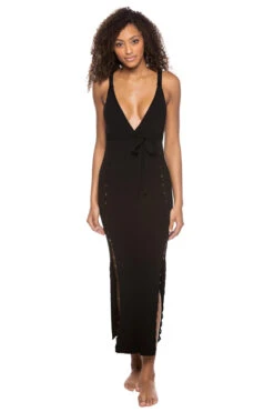 Octavia is a midi, ribbed knit dress with a plunging neckline, button detail at the shoulder straps and down the sides and is finished with a wrap tie under bust belt.