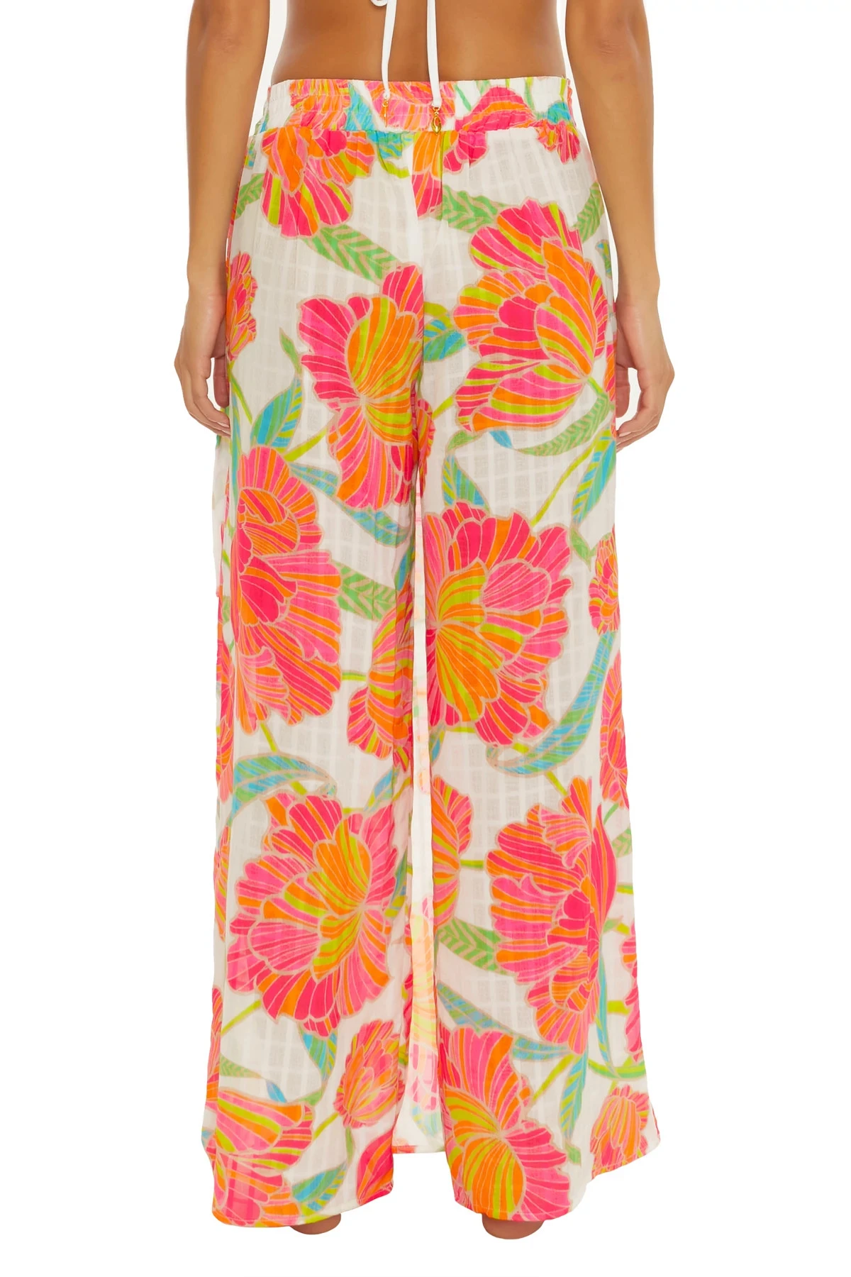 Poppy beach pant features a bright floral print and offers a wide leg with elastic back and a crossover overlay that ties at waist.