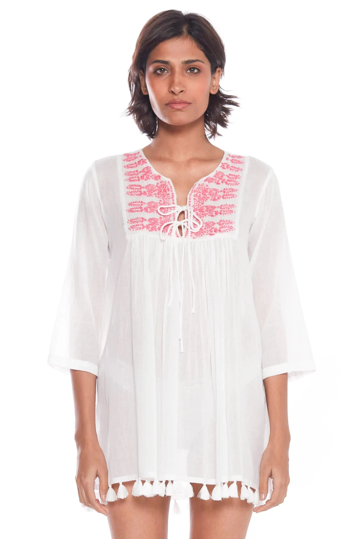 Seychelles tunic features a split lace up neckline with embroidered detail, 3/4 length sleeves, and a playful tassel hem.