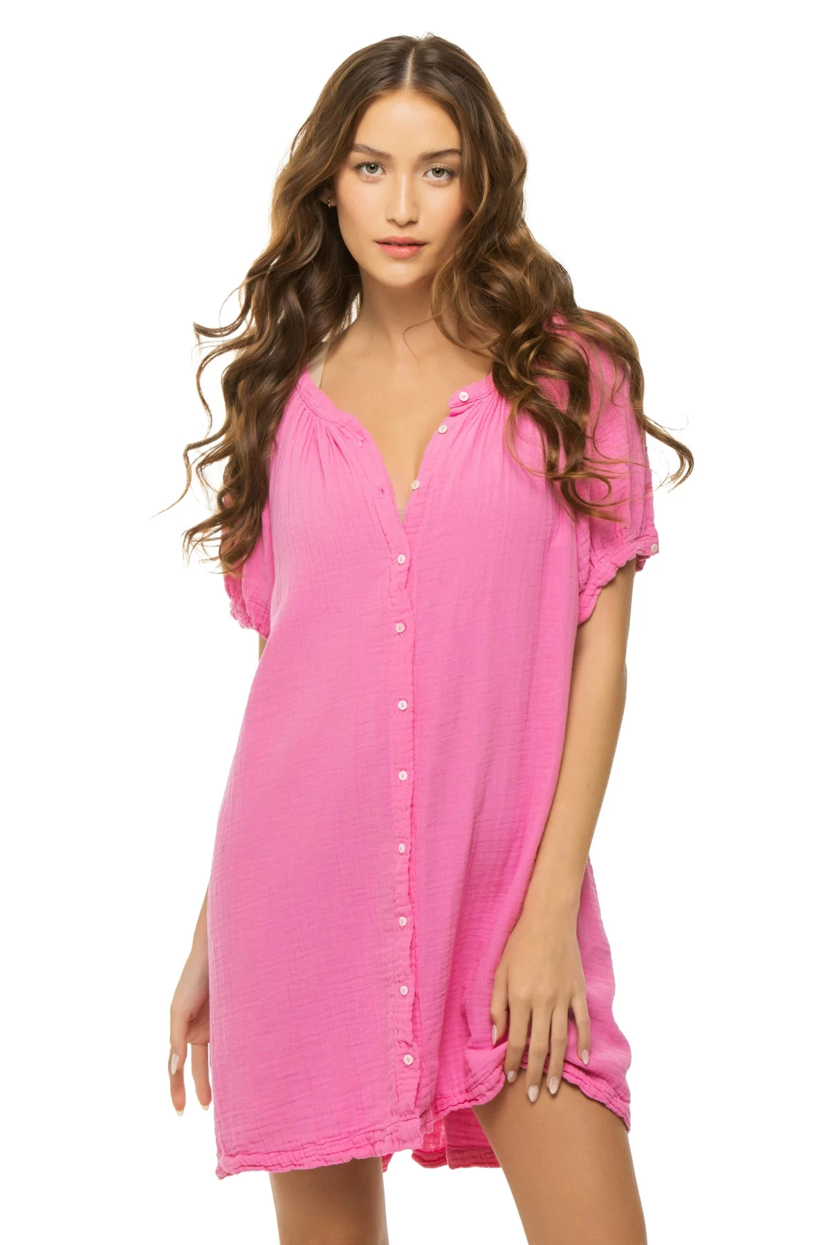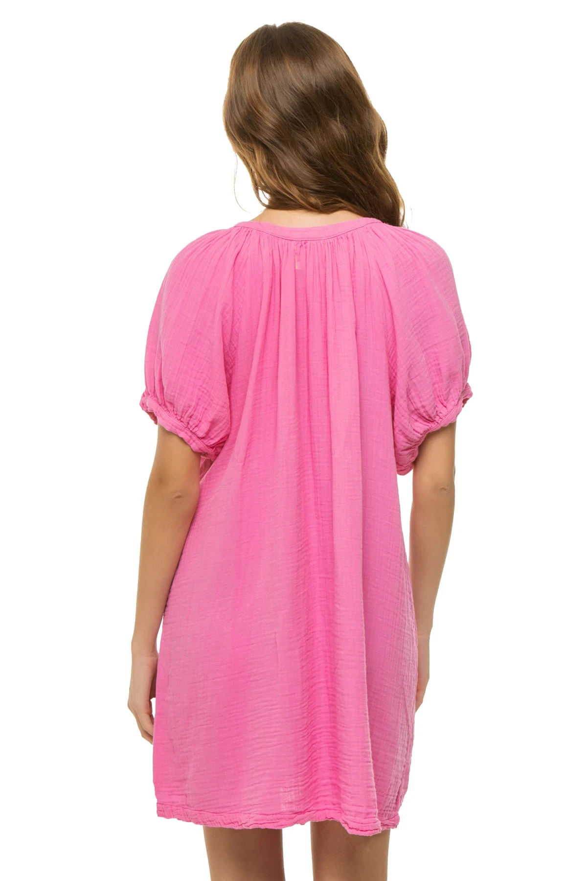 Sifnos mini dress features short puff sleeves and a round neckline that offers front button closures.