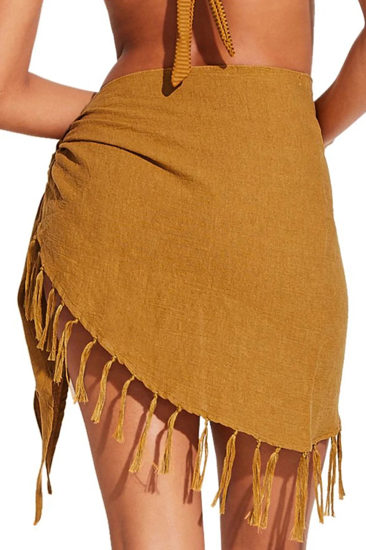 Sirena pareo features a fringe detailed trim and offers a tie at the waist.