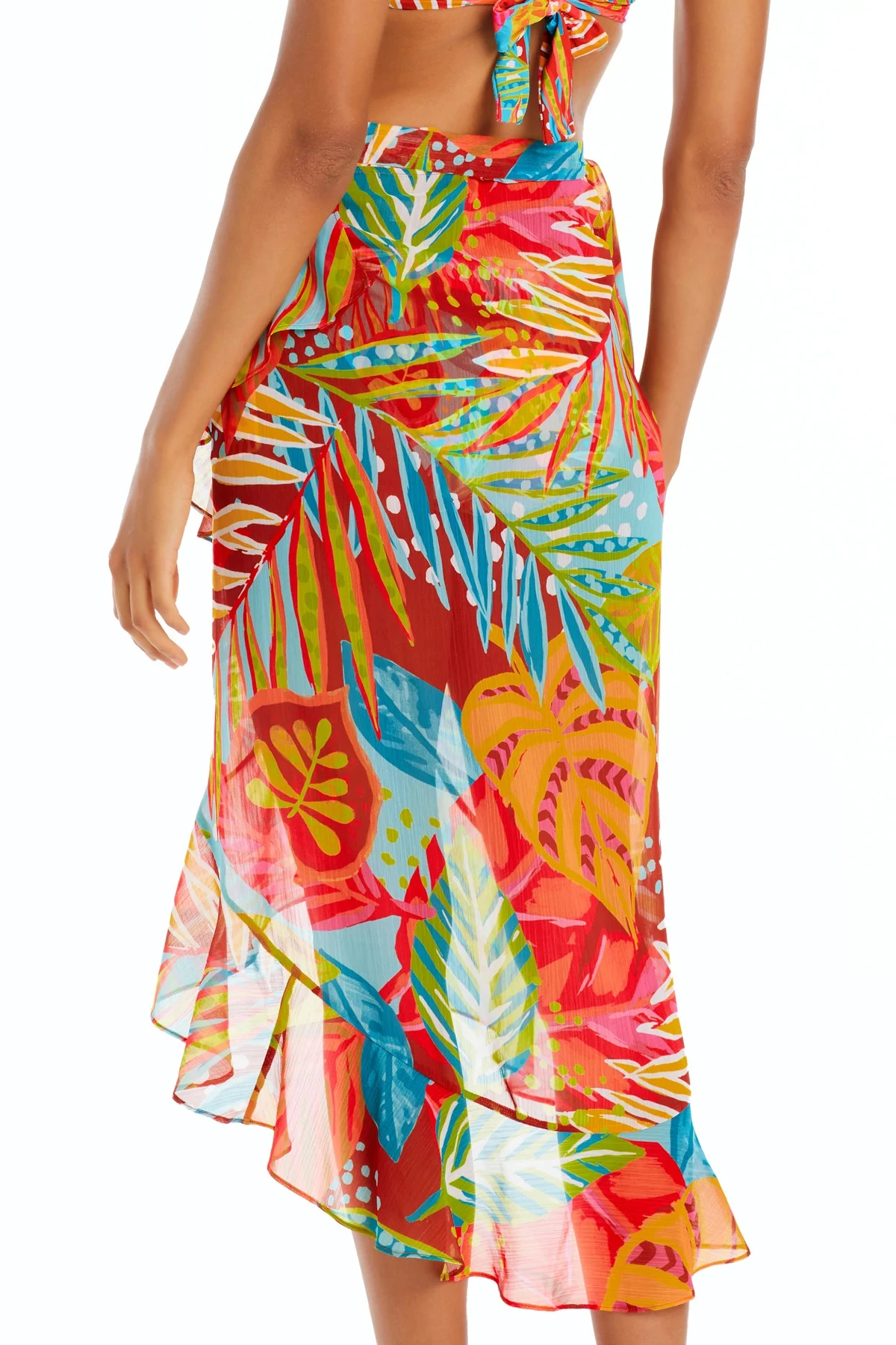 Sarong features a vibrant tropical print with a ruffled hem detail and offers an adjustable tie at the waist.