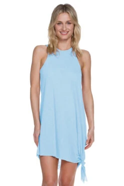 Mini dress features a high neckline with an adjustable knot side tie, slub burn out knit fabric and a keyhole back.