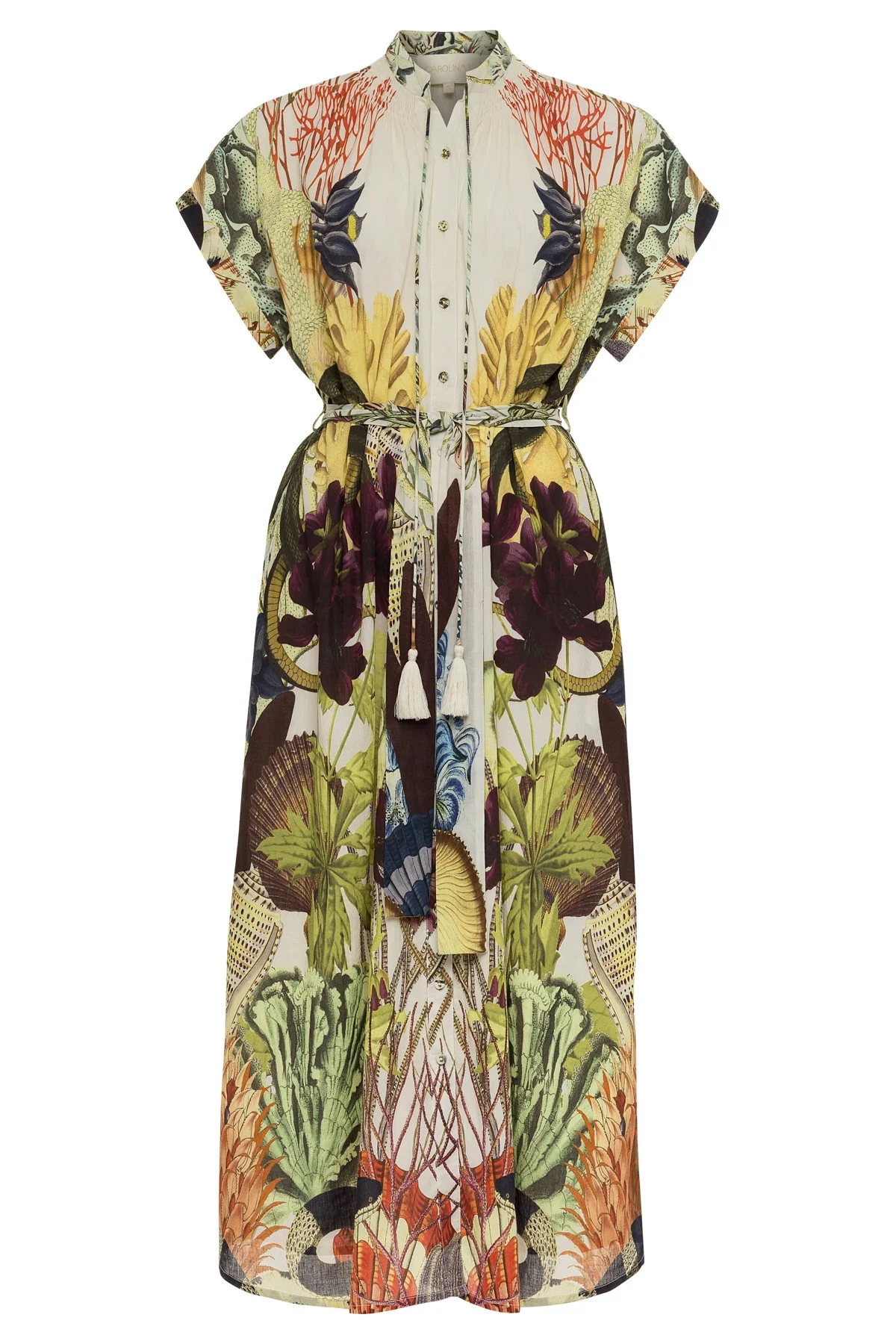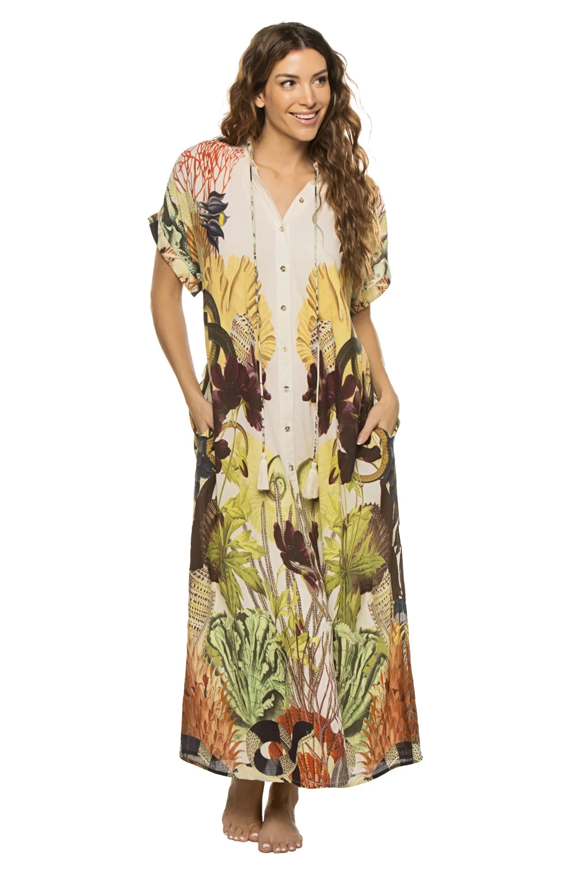 Valerie midi kaftan dress features a symmetrically placed print and offers a collared neckline, button closure, and tie waist.