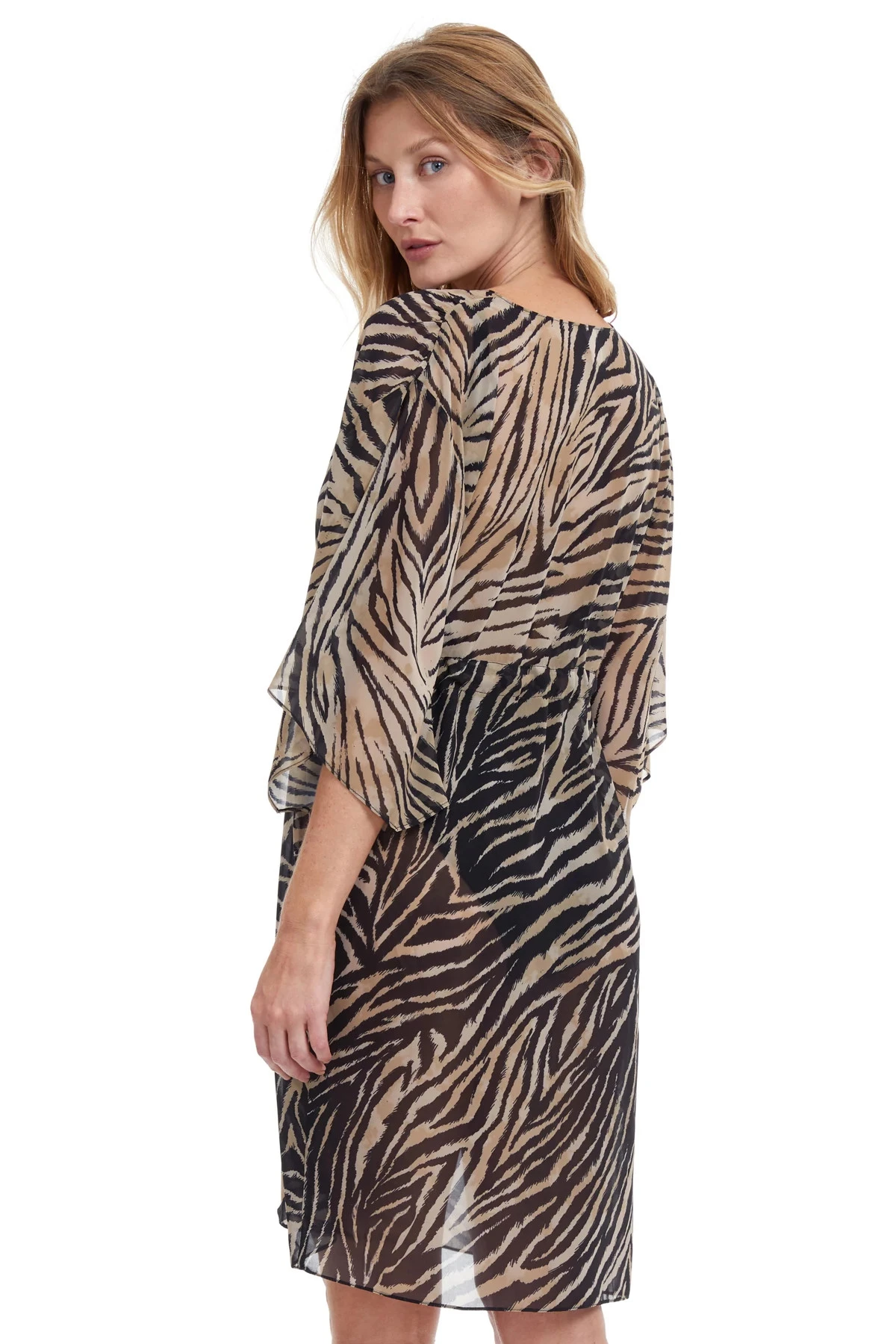 Wildlife tunic features a v-neck and three quarter sleeves ad offers drawstring ties under bust.